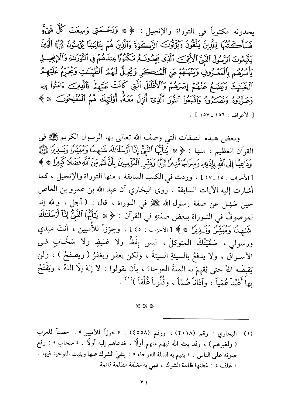 وبعض هذه الصفات التي وصف الله تعالى بها الرسول الكريم صلى الله عليه وسلم في القرآن العظيم، منها: يا أَيُّهَا النَّبِيُّ إِنَّا أَرْسَلْناكَ شاهِداً وَمُبَشِّراً وَنَذِيراً (45) وَداعِياً إِلَى اللَّهِ بِإِذْنِهِ وَسِراجاً مُنِيراً (46) وَبَشِّرِ الْمُؤْمِنِينَ بِأَنَّ لَهُمْ مِنَ اللَّهِ فَضْلًا كَبِيراً [الأحزاب: 45- 47] ، وردت في الكتب السابقة، منها التوراة والإنجيل، كما أشارت إليه الآيات السابقة. روى البخاري أن عبد الله بن عمرو بن العاص حين سئل عن صفة رسول الله صلى الله عليه وسلم في التوراة، قال: (أجل، والله إنه لموصوف في التوراة ببعض صفته في القرآن: يا أَيُّهَا النَّبِيُّ إِنَّا أَرْسَلْناكَ شاهِداً وَمُبَشِّراً وَنَذِيراً [الأحزاب: 45] . وحرزا للأميين، أنت عبدي ورسولي، سمّيتك المتوكل، ليس بفظّ ولا غليظ ولا سخّاب في الأسواق، ولا يدفع بالسيئة السيئة، ولكن يعفو ويغفر (ويصفح) ، ولن يقبضه الله حتى يقيم به الملة العوجاء، بأن يقولوا: لا إله إلّا الله، ويفتح بها أعينا عميا، وآذانا صمّا، وقلوبا غلفا) «1» .