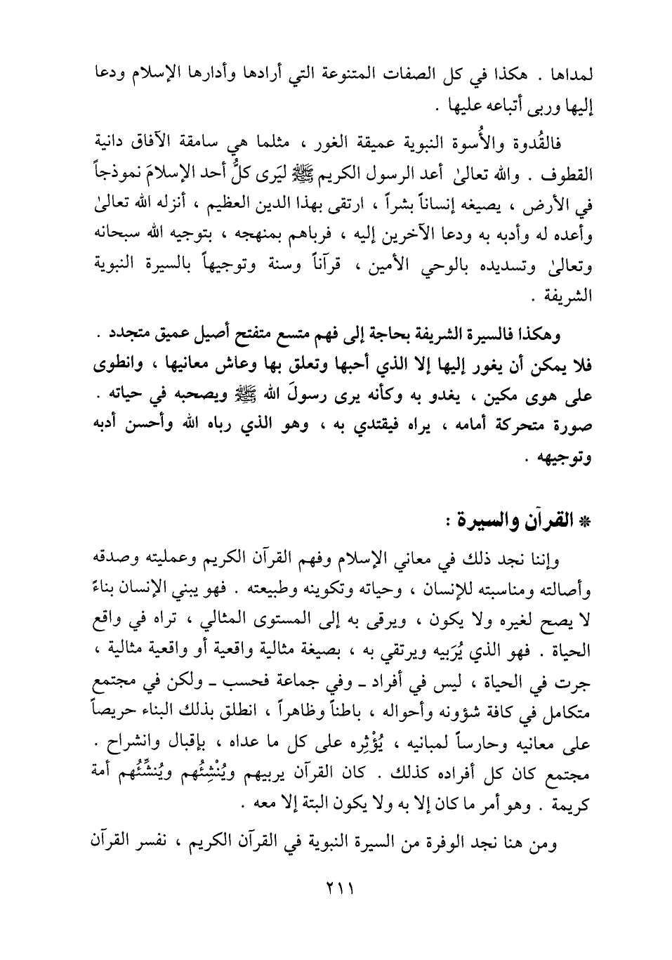 فالقدوة والأسوة النبوية عميقة الغور، مثلما هي سامقة الآفاق دانية القطوف. والله تعالى أعد الرسول الكريم صلّى الله عليه وسلّم ليرى كلّ أحد الإسلام نموذجا في الأرض، يصيغه إنسانا بشرا، ارتقى بهذا الدين العظيم، أنزله الله تعالى وأعده له وأدبه به ودعا الآخرين إليه، فرباهم بمنهجه، بتوجيه الله سبحانه وتعالى وتسديده بالوحي الأمين، قرآنا وسنة وتوجيها بالسيرة النبوية الشريفة.