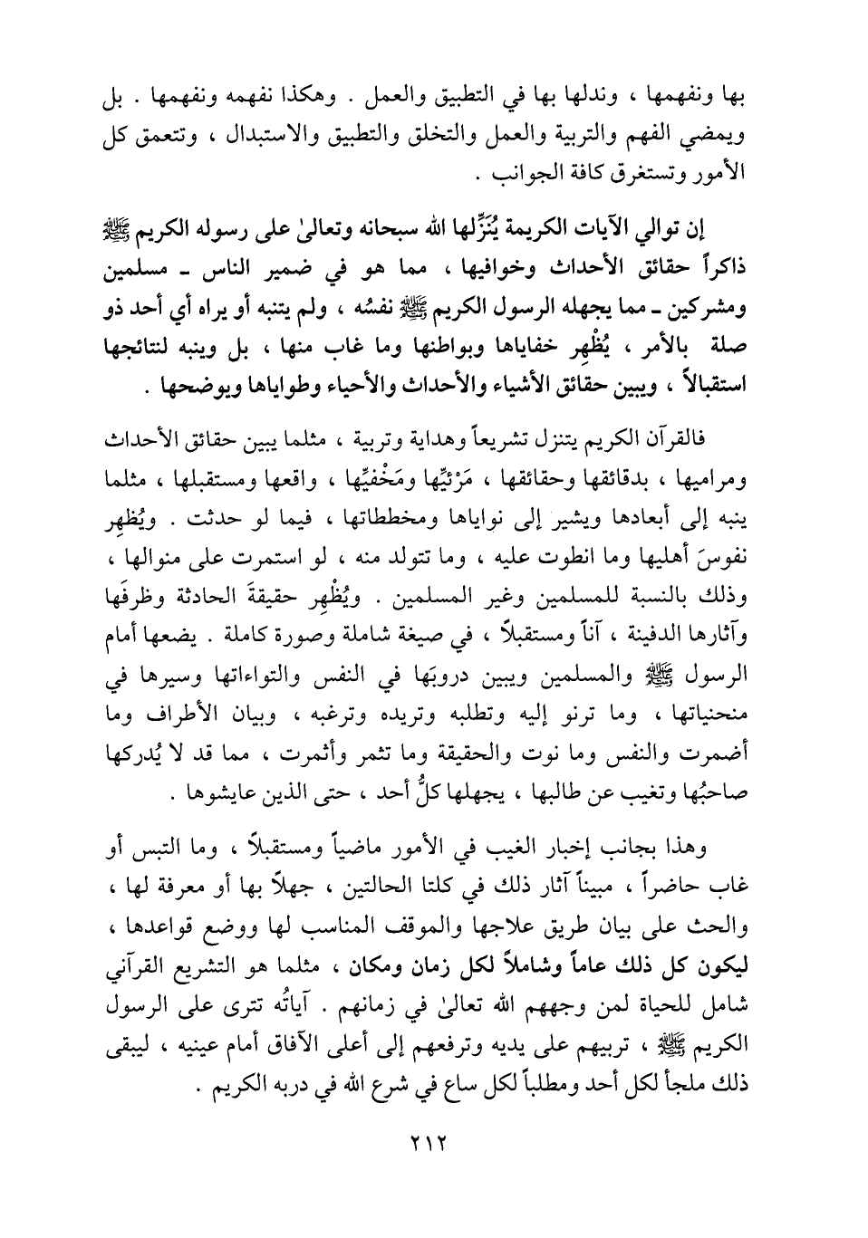 وهذا بجانب إخبار الغيب في الأمور ماضيا ومستقبلا، وما التبس أو غاب حاضرا، مبينا آثار ذلك في كلتا الحالتين، جهلا بها أو معرفة لها، والحث على بيان طريق علاجها والموقف المناسب لها ووضع قواعدها، ليكون كل ذلك عاما وشاملا لكل زمان ومكان، مثلما هو التشريع القرآني شامل للحياة لمن وجههم الله تعالى في زمانهم. آياته تترى على الرسول الكريم صلّى الله عليه وسلّم، تربيهم على يديه وترفعهم إلى أعلى الآفاق أمام عينيه، ليبقى ذلك ملجأ لكل أحد ومطلبا لكل ساع في شرع الله في دربه الكريم.
