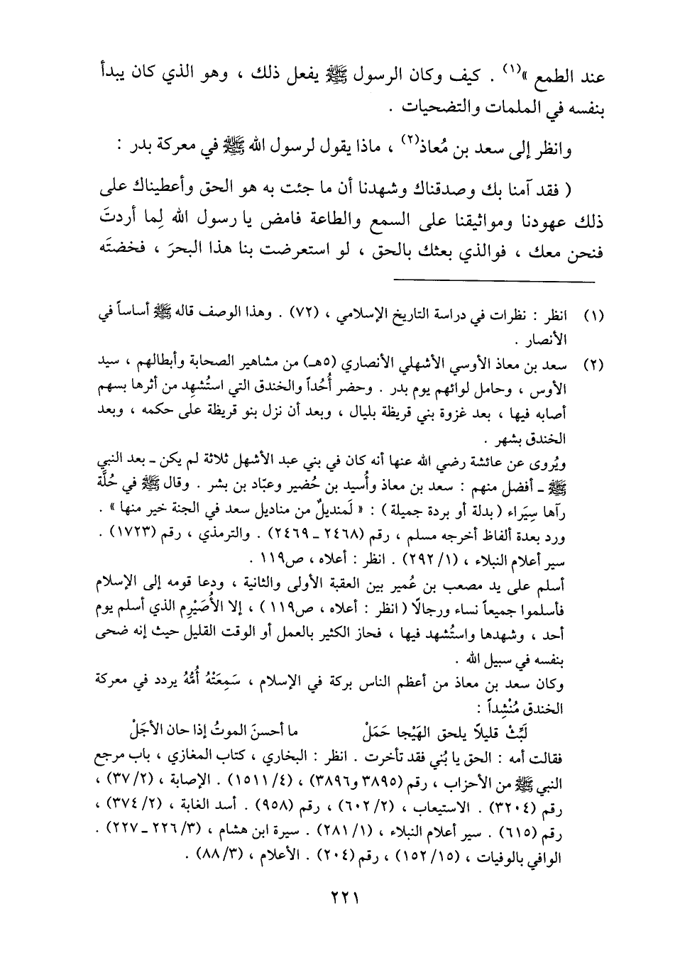 (1) انظر: نظرات في دراسة التاريخ الإسلامي، (72) . وهذا الوصف قاله صلّى الله عليه وسلّم أساسا في الأنصار.