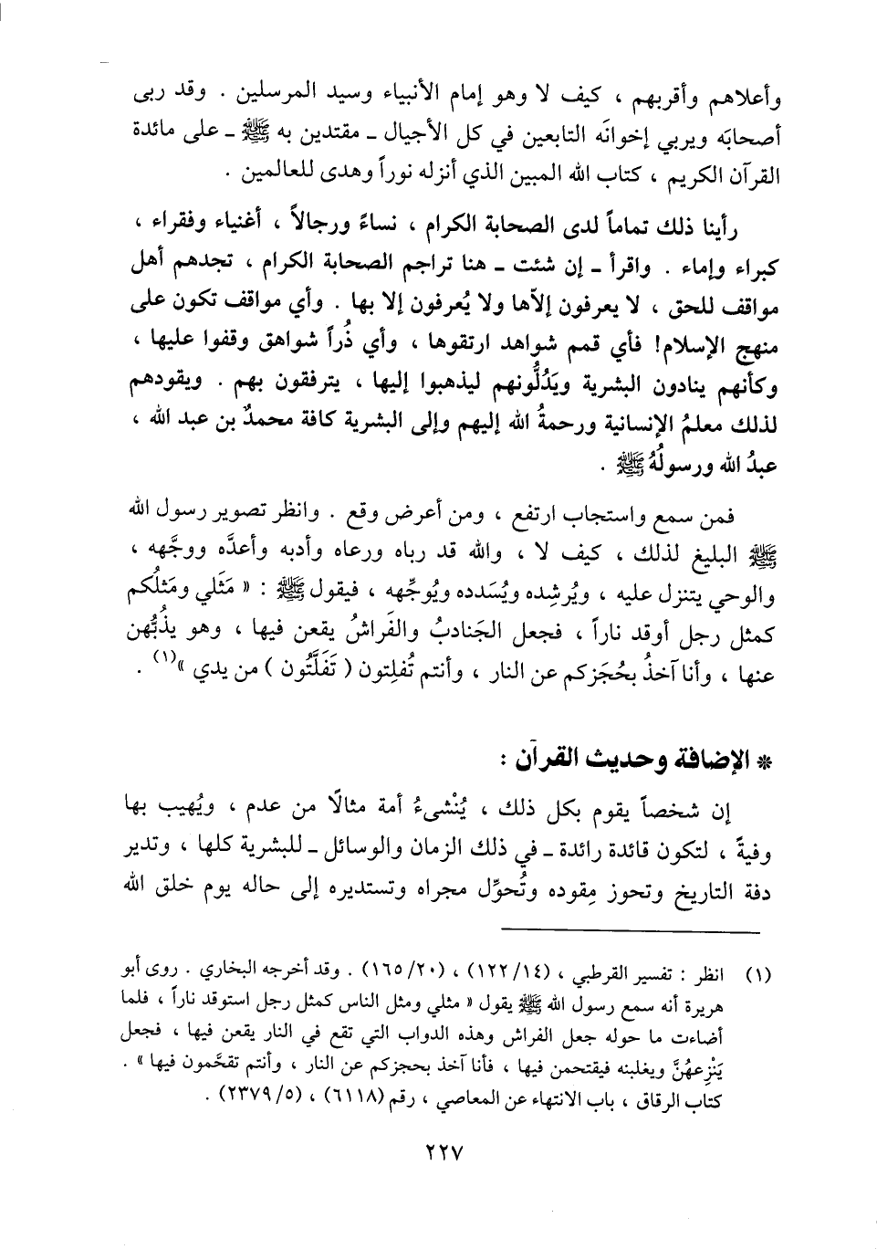 فمن سمع واستجاب ارتفع، ومن أعرض وقع. وانظر تصوير رسول الله صلى الله عليه وسلّم البليغ لذلك، كيف لا، والله قد رباه ورعاه وأدبه وأعدّه ووجّهه، والوحي يتنزل عليه، ويرشده ويسدده ويوجّهه، فيقول صلّى الله عليه وسلم: «مثلي ومثلكم كمثل رجل أوقد نارا، فجعل الجنادب والفراش يقعن فيها، وهو يذبّهن عنها، وأنا آخذ بحجزكم عن النار، وأنتم تفلتون (تفلّتون) من يدي» «1» .