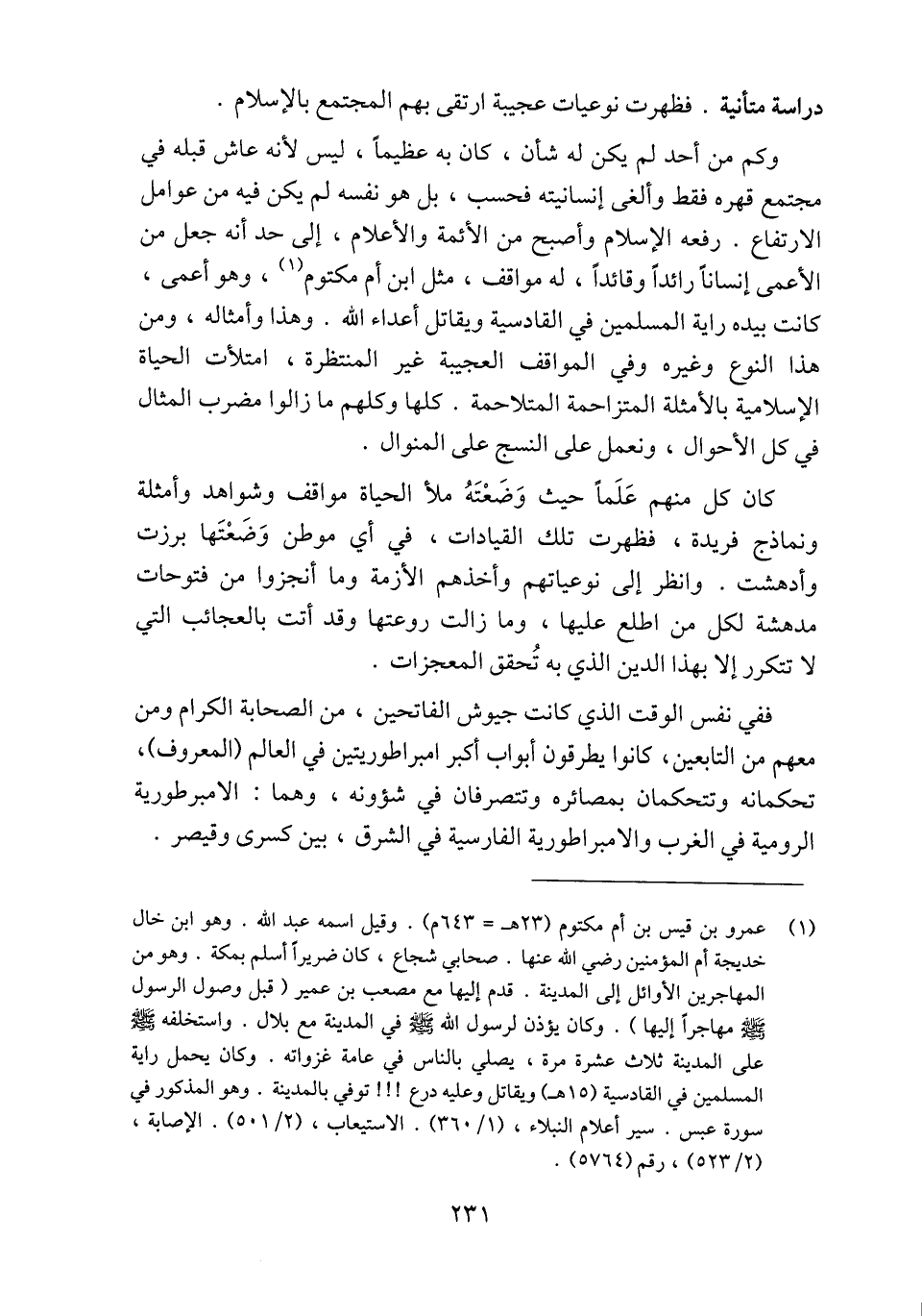 وكم من أحد لم يكن له شأن، كان به عظيما، ليس لأنه عاش قبله في مجتمع قهره فقط وألغى إنسانيته فحسب، بل هو نفسه لم يكن فيه من عوامل الارتفاع. رفعه الإسلام وأصبح من الأئمة والأعلام، إلى حد أنه جعل من الأعمى إنسانا رائدا وقائدا، له مواقف، مثل ابن أم مكتوم «1» ، وهو أعمى، كانت بيده راية المسلمين في القادسية ويقاتل أعداء الله. وهذا وأمثاله، ومن هذا النوع وغيره وفي المواقف العجيبة غير المنتظرة، امتلأت الحياة الإسلامية بالأمثلة المتزاحمة المتلاحمة. كلها وكلهم ما زالوا مضرب المثال في كل الأحوال، ونعمل على النسج على المنوال.