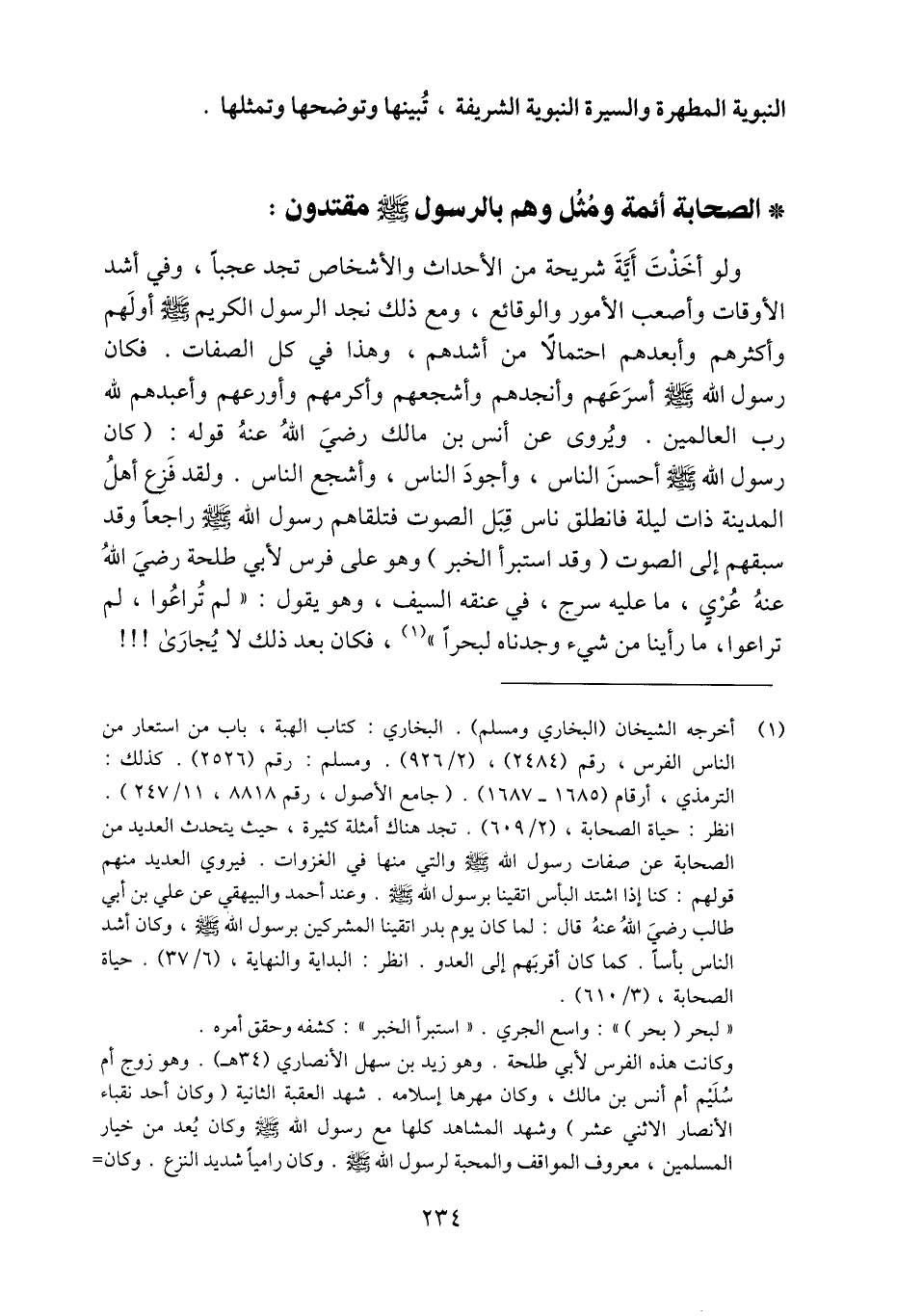 (1) أخرجه الشيخان (البخاري ومسلم) . البخاري: كتاب الهبة، باب من استعار من الناس الفرس، رقم (2484) ، (2/ 926) . ومسلم: رقم (2526) . كذلك: الترمذي، أرقام (1685- 1687) . (جامع الأصول، رقم 8818، 11/ 247) . انظر: حياة الصحابة، (2/ 609) . تجد هناك أمثلة كثيرة، حيث يتحدث العديد من الصحابة عن صفات رسول الله صلّى الله عليه وسلّم والتي منها في الغزوات. فيروي العديد منهم قولهم: كنا إذا اشتد البأس اتقينا برسول الله صلى الله عليه وسلم. وعند أحمد والبيهقي عن علي بن أبي طالب رضي الله عنه قال: لما كان يوم بدر اتقينا المشركين برسول الله صلّى الله عليه وسلم، وكان أشد الناس بأسا. كما كان أقربهم إلى العدو. انظر: البداية والنهاية، (6/ 37) . حياة الصحابة، (3/ 610) . «لبحر (بحر) » : واسع الجري. «استبرأ الخبر» : كشفه وحقق أمره. وكانت هذه الفرس لأبي طلحة. وهو زيد بن سهل الأنصاري (34 هـ) . وهو زوج أم سليم أم أنس بن مالك، وكان مهرها إسلامه. شهد العقبة الثانية (وكان أحد نقباء الأنصار الاثني عشر) وشهد المشاهد كلها مع رسول الله صلّى الله عليه وسلّم وكان يعد من خيار المسلمين، معروف المواقف والمحبة لرسول الله صلّى الله عليه وسلم. وكان راميا شديد النزع. وكان