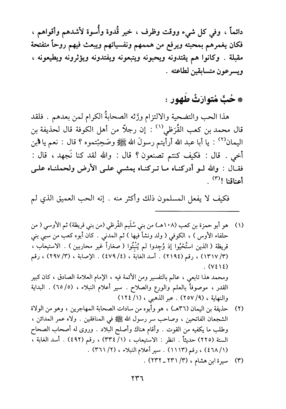 هذا الحب والتضحية والالتزام ورّثه الصحابة الكرام لمن بعدهم. فلقد قال محمد بن كعب القرظي «1» : إن رجلا من أهل الكوفة قال لحذيفة بن اليمان «2» : يا أبا عبد الله أرأيتم رسول الله صلّى الله عليه وسلّم وصحبتموه؟ قال: نعم يا بن أخي. قال: فكيف كنتم تصنعون؟ قال: والله لقد كنا نجهد، قال: