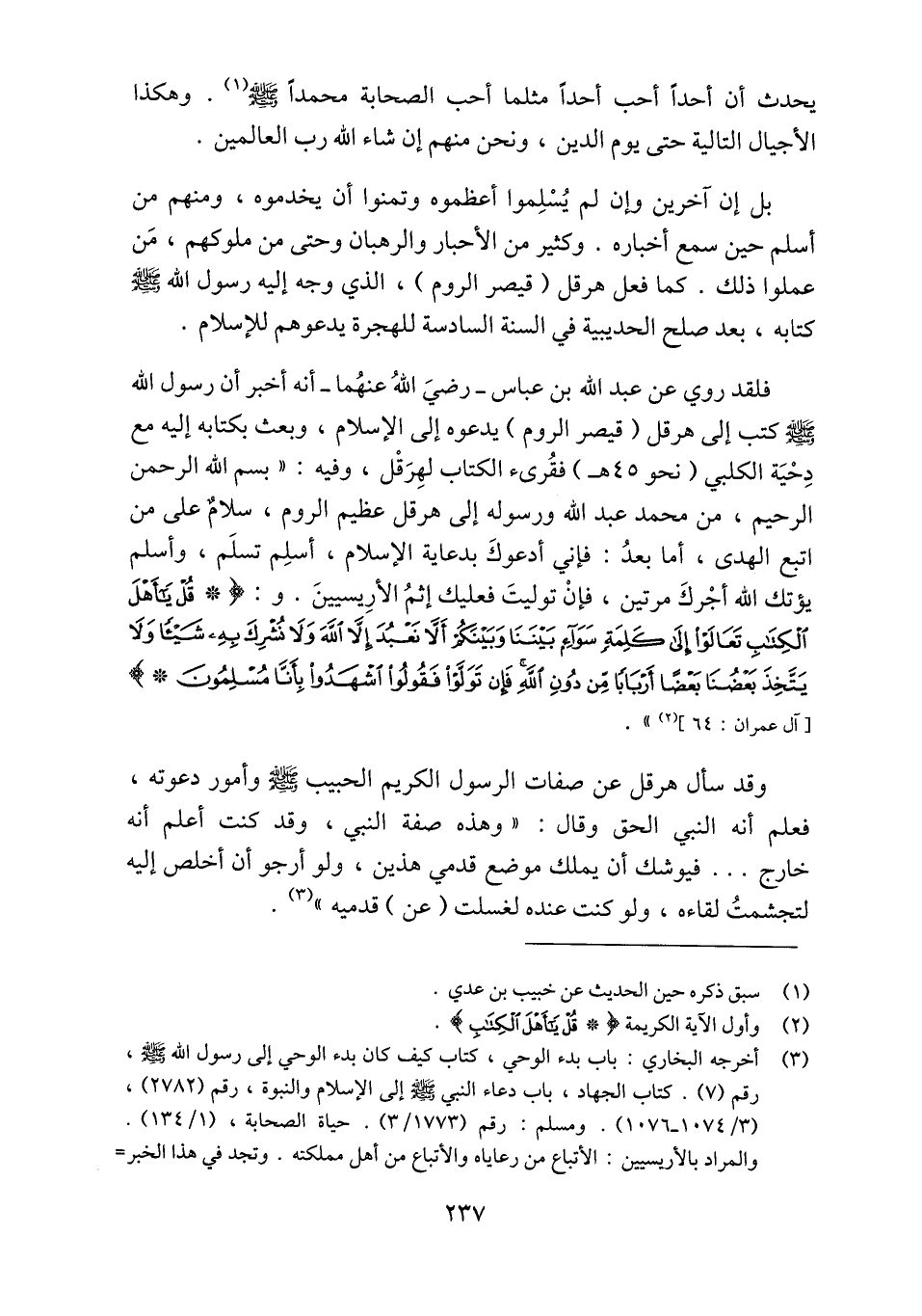 (3) أخرجه البخاري: باب بدء الوحي، كتاب كيف كان بدء الوحي إلى رسول الله صلّى الله عليه وسلم، رقم (7) . كتاب الجهاد، باب دعاء النبي صلّى الله عليه وسلّم إلى الإسلام والنبوة، رقم (2782) ، (3/ 1074- 1076) . ومسلم: رقم (1773/ 3) . حياة الصحابة، (1/ 134) . والمراد بالأريسيين: الأتباع من رعاياه والأتباع من أهل مملكته. وتجد في هذا الخبر