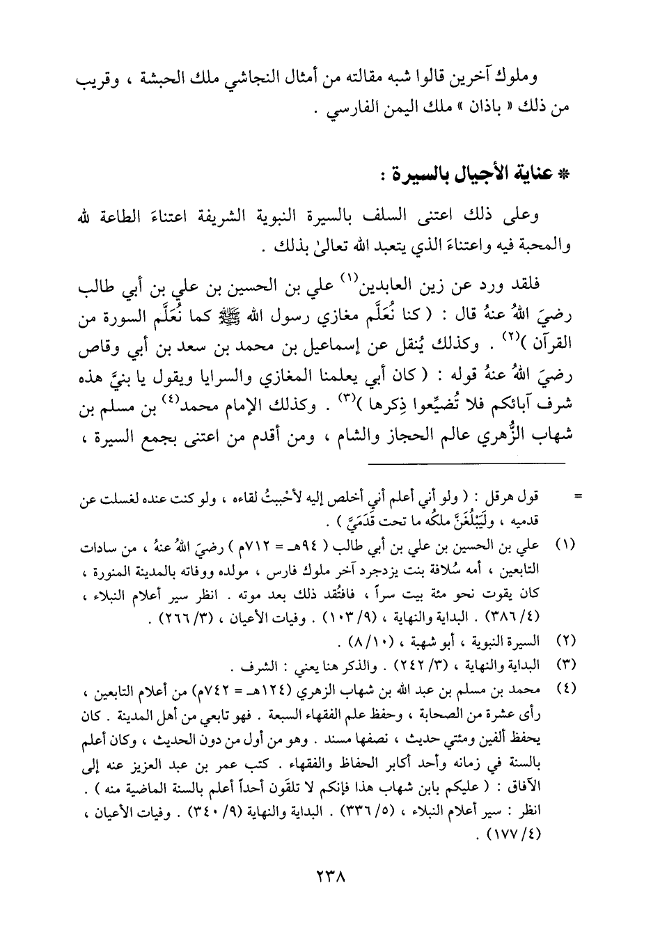 فلقد ورد عن زين العابدين «1» علي بن الحسين بن علي بن أبي طالب رضي الله عنه قال: (كنا نعلّم مغازي رسول الله صلّى الله عليه وسلّم كما نعلّم السورة من القرآن) «2» . وكذلك ينقل عن إسماعيل بن محمد بن سعد بن أبي وقاص رضي الله عنه قوله: (كان أبي يعلمنا المغازي والسرايا ويقول يا بنيّ هذه شرف آبائكم فلا تضيّعوا ذكرها) «3» . وكذلك الإمام محمد «4» بن مسلم بن شهاب الزّهري عالم الحجاز والشام، ومن أقدم من اعتنى بجمع السيرة،