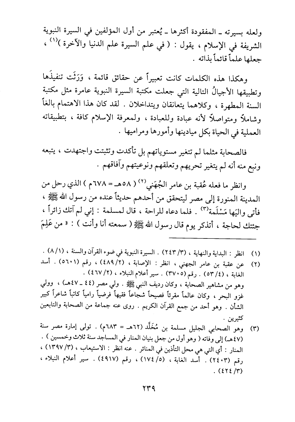 (2) عن عقبة بن عامر الجهني، انظر: الإصابة، (2/ 489) ، رقم (5601) . أسد الغابة، (4/ 53) . رقم (3705) . سير أعلام النبلاء، (2/ 467) . وهو من مشاهير الصحابة، وكان رديف النبي صلّى الله عليه وسلم. ولي مصر (44- 47 هـ) ، وولي غزو البحر، وكان عالما مقرئا فصيحا شجاعا فقيها فرضيا راميا كاتبا شاعرا كبير الشأن. وهو أحد من جمع القرآن الكريم. روى عنه جماعة من الصحابة والتابعين كثيرين.