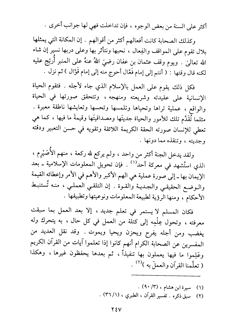 فكان المسلم لا يستمر في تعلم جديد، إلا بعد العمل بما سبقت معرفته، وتحول علمه إلى كتلة من العمل في كل حال، به يتحرك وله يغضب ومن أجله يفرح ويحزن ويحيا ويموت. وقد نقل العديد من المفسرين عن الصحابة الكرام أنهم كانوا إذا تعلموا آيات من القرآن الكريم وعلموا ما فيها يعملون بها تنفيذا، ثم بعدها يحفظون غيرها، وهكذا (تعلّمنا القرآن والعمل به) «2» .