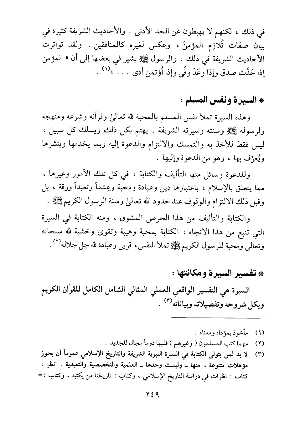 (3) لا بد لمن يتولى الكتابة في السيرة النبوية الشريفة والتاريخ الإسلامي عموما أن يحوز مؤهلات متنوعة، منها- وليست وحدها- العلمية والتخصصية والتعبدية. انظر: كتاب: نظرات في دراسة التاريخ الإسلامي، وكتاب: تاريخنا من يكتبه، وكتاب: