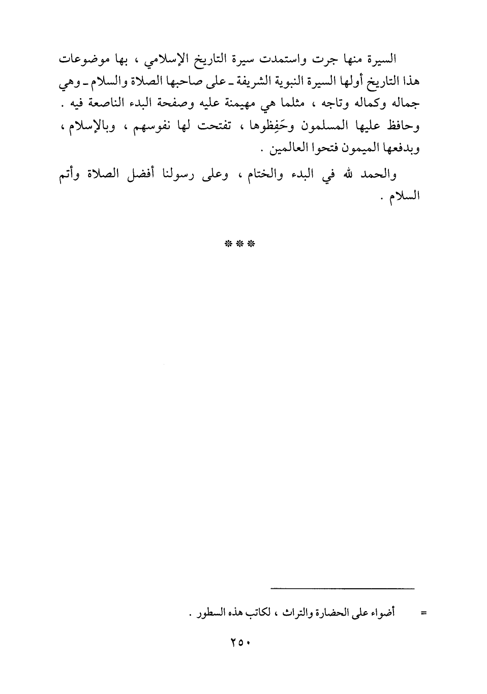 السيرة منها جرت واستمدت سيرة التاريخ الإسلامي، بها موضوعات هذا التاريخ أولها السيرة النبوية الشريفة- على صاحبها الصلاة والسلام- وهي جماله وكماله وتاجه، مثلما هي مهيمنة عليه وصفحة البدء الناصعة فيه.