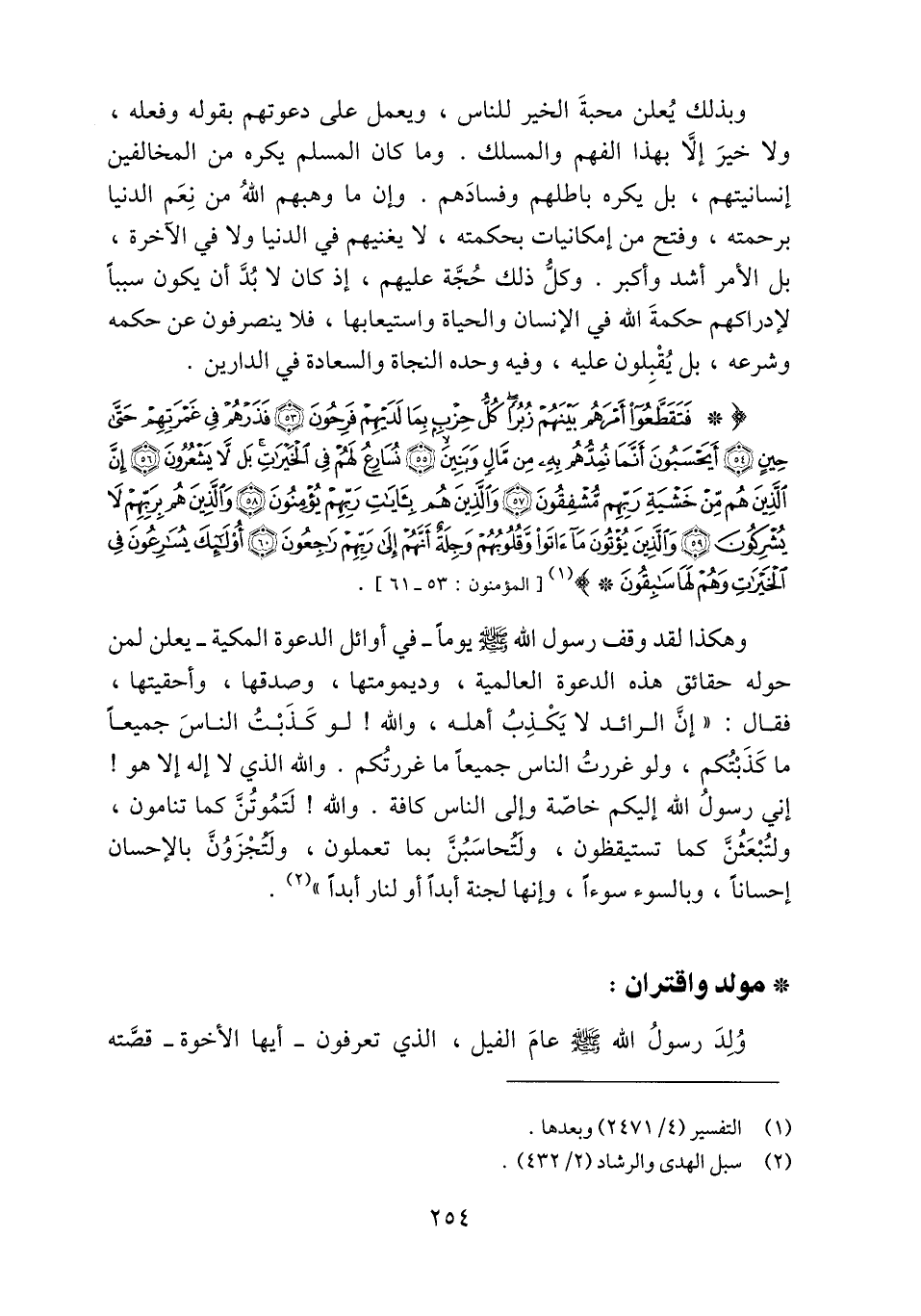 وهكذا لقد وقف رسول الله صلّى الله عليه وسلّم يوما- في أوائل الدعوة المكية- يعلن لمن حوله حقائق هذه الدعوة العالمية، وديمومتها، وصدقها، وأحقيتها، فقال: «إنّ الرائد لا يكذب أهله، والله! لو كذبت الناس جميعا ما كذبتكم، ولو غررت الناس جميعا ما غررتكم. والله الذي لا إله إلا هو! إني رسول الله إليكم خاصّة وإلى الناس كافة. والله! لتموتنّ كما تنامون، ولتبعثنّ كما تستيقظون، ولتحاسبنّ بما تعملون، ولتجزونّ بالإحسان إحسانا، وبالسوء سوآ، وإنها لجنة أبدا أو لنار أبدا» «2» .