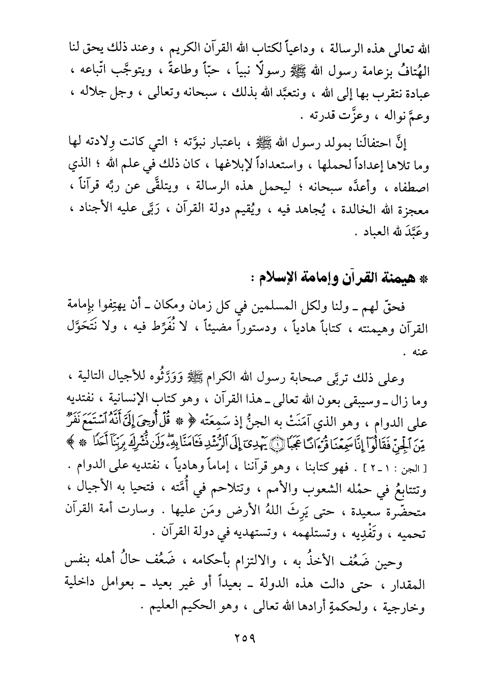 الله تعالى هذه الرسالة، وداعيا لكتاب الله القرآن الكريم، وعند ذلك يحق لنا الهتاف بزعامة رسول الله صلّى الله عليه وسلّم رسولا نبيا، حبّا وطاعة، ويتوجّب اتّباعه، عبادة نتقرب بها إلى الله، ونتعبّد الله بذلك، سبحانه وتعالى، وجل جلاله، وعمّ نواله، وعزّت قدرته.