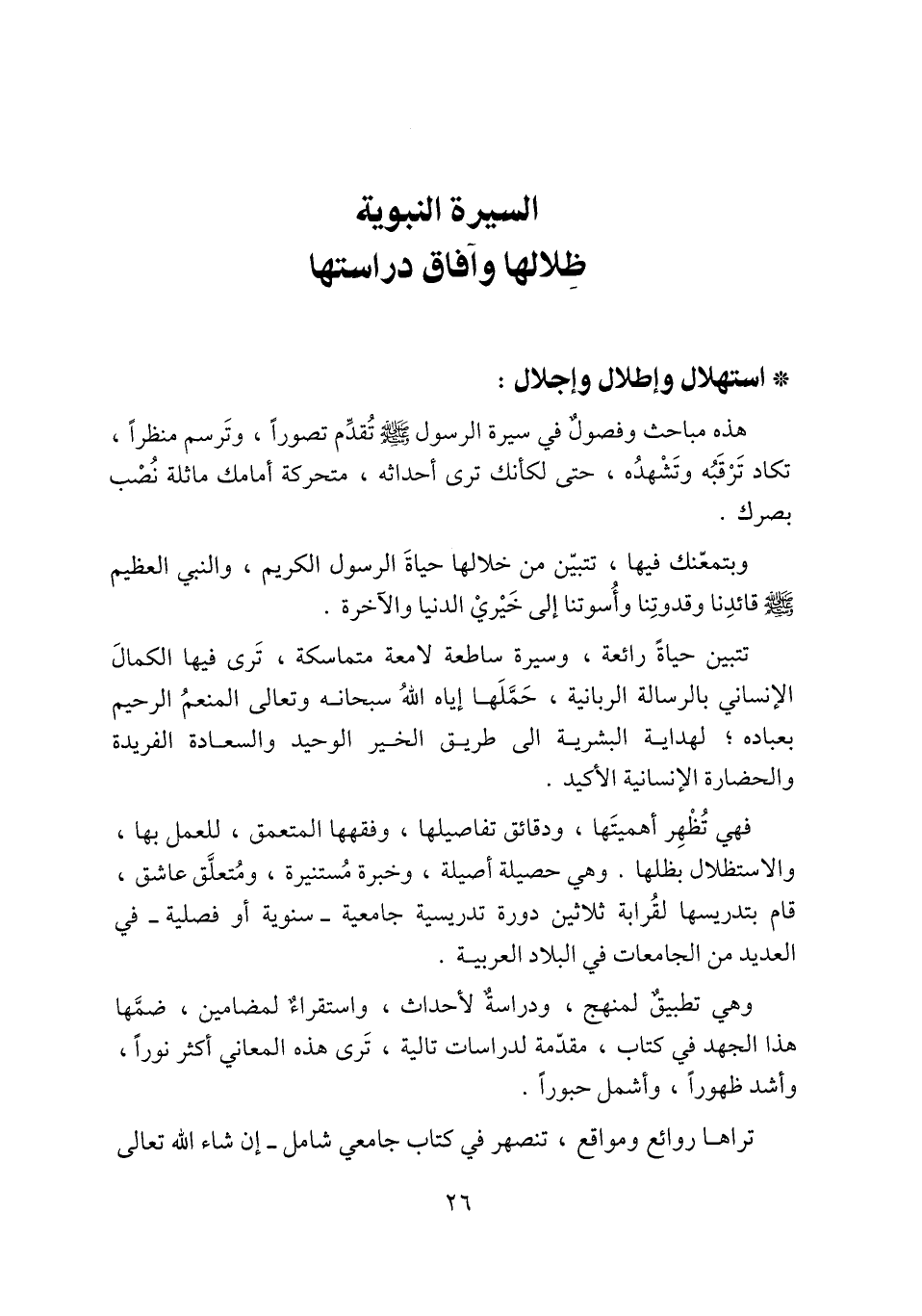 هذه مباحث وفصول في سيرة الرسول صلى الله عليه وسلم تقدّم تصورا، وترسم منظرا، تكاد ترقبه وتشهده، حتى لكأنك ترى أحداثه، متحركة أمامك ماثلة نصب بصرك.