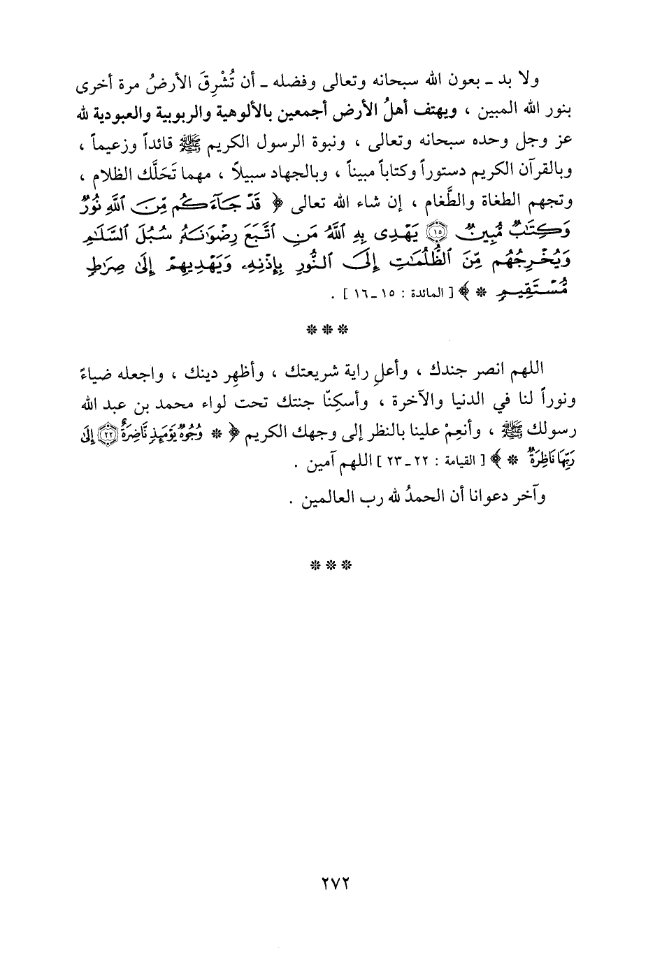 اللهم انصر جندك، وأعل راية شريعتك، وأظهر دينك، واجعله ضياء ونورا لنا في الدنيا والآخرة، وأسكنّا جنتك تحت لواء محمد بن عبد الله رسولك صلّى الله عليه وسلم، وأنعم علينا بالنظر إلى وجهك الكريم وُجُوهٌ يَوْمَئِذٍ ناضِرَةٌ (22) إِلى رَبِّها ناظِرَةٌ [القيامة: 22- 23] اللهم آمين.