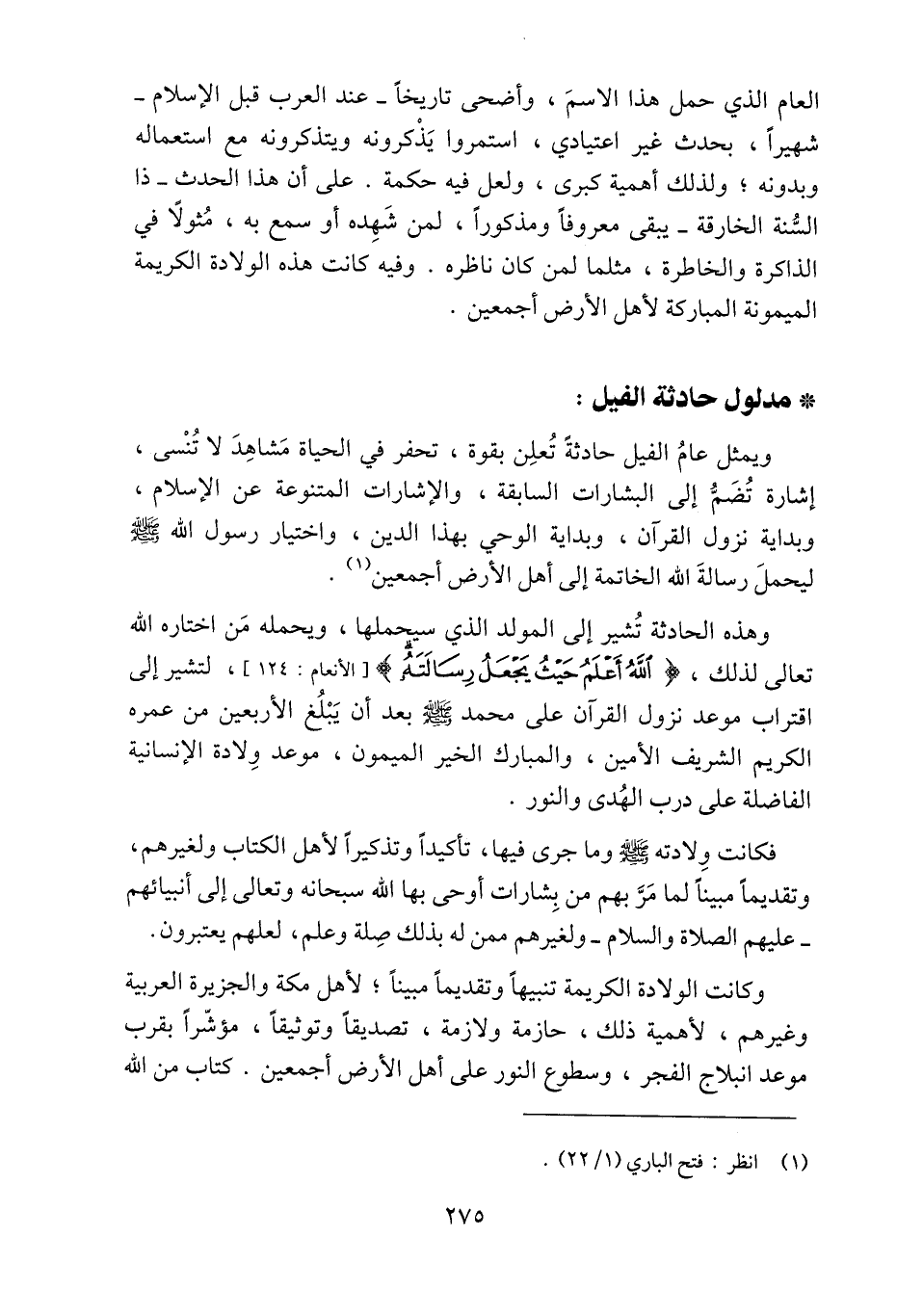 ويمثل عام الفيل حادثة تعلن بقوة، تحفر في الحياة مشاهد لا تنسى، إشارة تضمّ إلى البشارات السابقة، والإشارات المتنوعة عن الإسلام، وبداية نزول القرآن، وبداية الوحي بهذا الدين، واختيار رسول الله صلّى الله عليه وسلم ليحمل رسالة الله الخاتمة إلى أهل الأرض أجمعين «1» .