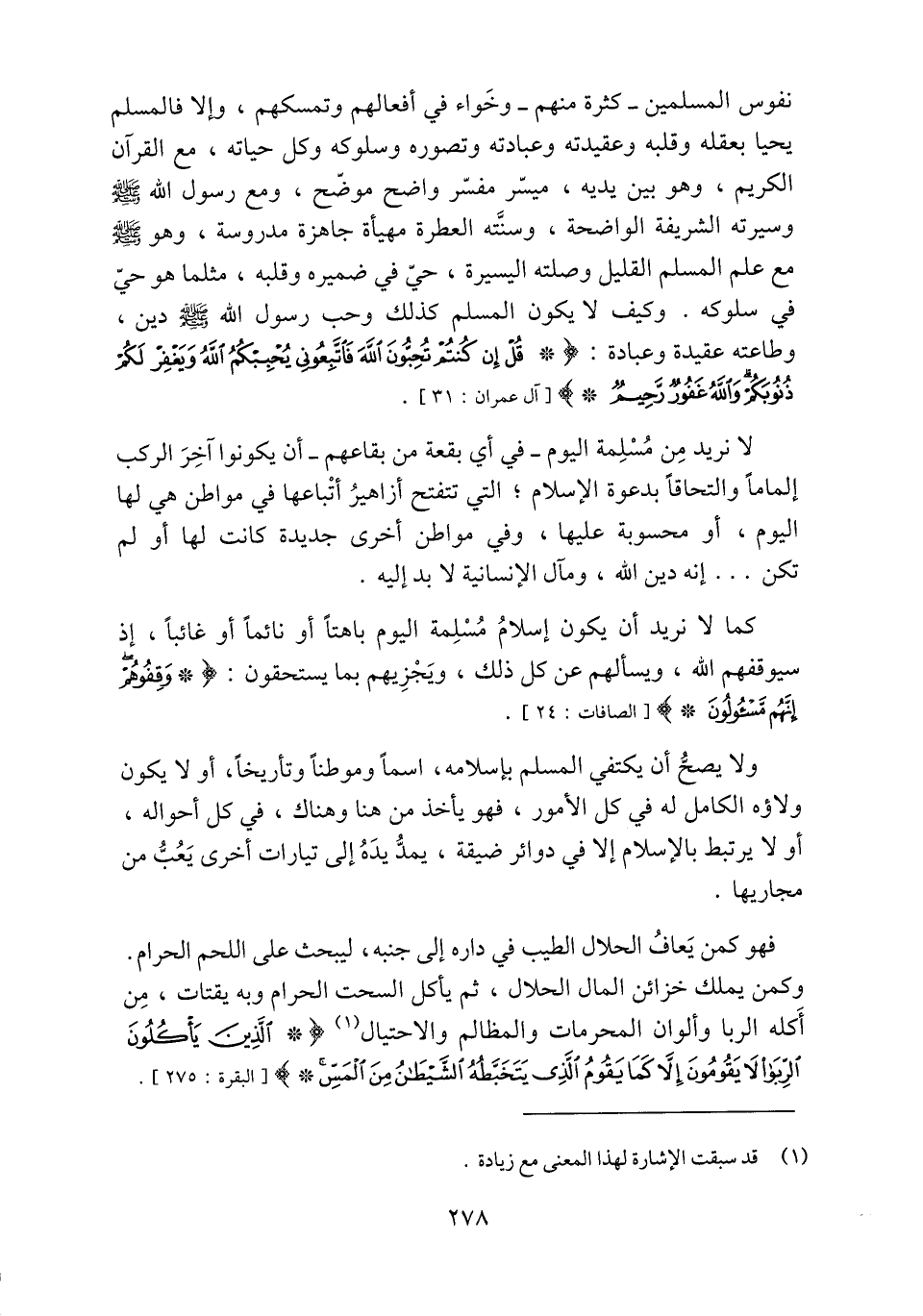 نفوس المسلمين- كثرة منهم- وخواء في أفعالهم وتمسكهم، وإلا فالمسلم يحيا بعقله وقلبه وعقيدته وعبادته وتصوره وسلوكه وكل حياته، مع القرآن الكريم، وهو بين يديه، ميسّر مفسّر واضح موضّح، ومع رسول الله صلّى الله عليه وسلم وسيرته الشريفة الواضحة، وسنّته العطرة مهيأة جاهزة مدروسة، وهو صلّى الله عليه وسلم مع علم المسلم القليل وصلته اليسيرة، حيّ في ضميره وقلبه، مثلما هو حيّ في سلوكه. وكيف لا يكون المسلم كذلك وحب رسول الله صلّى الله عليه وسلّم دين، وطاعته عقيدة وعبادة: قُلْ إِنْ كُنْتُمْ تُحِبُّونَ اللَّهَ فَاتَّبِعُونِي يُحْبِبْكُمُ اللَّهُ وَيَغْفِرْ لَكُمْ ذُنُوبَكُمْ وَاللَّهُ غَفُورٌ رَحِيمٌ [آل عمران: 31] .