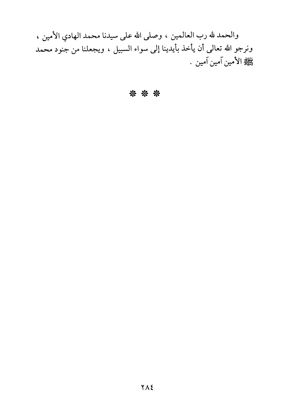 والحمد لله رب العالمين، وصلّى الله على سيدنا محمد الهادي الأمين، ونرجو الله تعالى أن يأخذ بأيدينا إلى سواء السبيل، ويجعلنا من جنود محمد صلى الله عليه وسلّم الأمين آمين آمين.