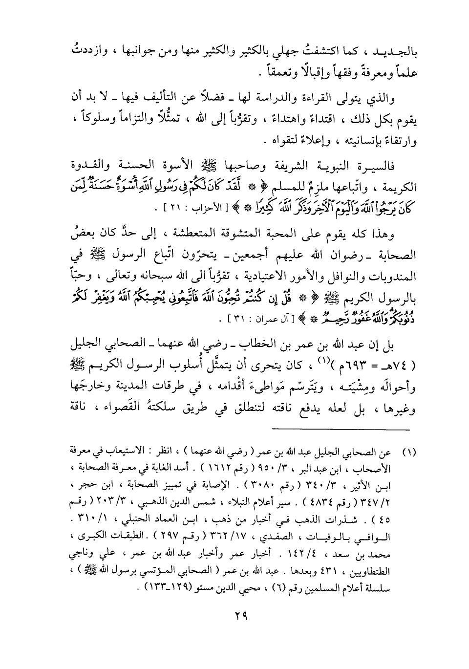 (1) عن الصحابي الجليل عبد الله بن عمر (رضي الله عنهما) ، انظر: الاستيعاب في معرفة الأصحاب، ابن عبد البر، 3/ 950 (رقم 1612) . أسد الغابة في معرفة الصحابة، ابن الأثير، 3/ 340 (رقم 3080) . الإصابة في تمييز الصحابة، ابن حجر، 2/ 347 (رقم 4834) . سير أعلام النبلاء، شمس الدين الذهبي، 3/ 203 (رقم 45) . شذرات الذهب في أخبار من ذهب، ابن العماد الحنبلي، 1/ 310. الوافي بالوفيات، الصفدي، 17/ 362 (رقم 297) . الطبقات الكبرى، محمد بن سعد، 4/ 142. أخبار عمر وأخبار عبد الله بن عمر، علي وناجي الطنطاويين، 431 وبعدها. عبد الله بن عمر (الصحابي المؤتسي برسول الله صلى الله عليه وسلم) ، سلسلة أعلام المسلمين رقم (6) ، محيي الدين مستو (129- 133) .