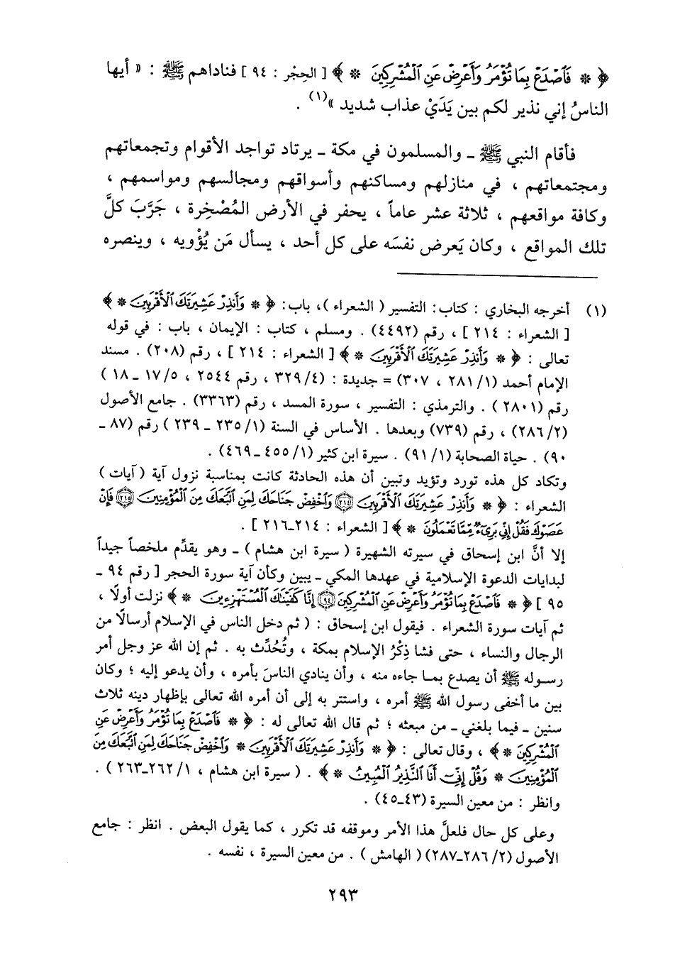 (1) أخرجه البخاري: كتاب: التفسير (الشعراء) ، باب: وَأَنْذِرْ عَشِيرَتَكَ الْأَقْرَبِينَ [الشعراء: 214] ، رقم (4492) . ومسلم، كتاب: الإيمان، باب: في قوله تعالى: وَأَنْذِرْ عَشِيرَتَكَ الْأَقْرَبِينَ [الشعراء: 214] ، رقم (208) . مسند الإمام أحمد (1/ 281، 307) جديدة: (4/ 329، رقم 2544، 5/ 17- 18) رقم (2801) . والترمذي: التفسير، سورة المسد، رقم (3363) . جامع الأصول (2/ 286) ، رقم (739) وبعدها. الأساس في السنة (1/ 235- 239) رقم (87- 90) . حياة الصحابة (1/ 91) . سيرة ابن كثير (1/ 455- 469) . وتكاد كل هذه تورد وتؤيد وتبين أن هذه الحادثة كانت بمناسبة نزول آية (آيات) الشعراء: وَأَنْذِرْ عَشِيرَتَكَ الْأَقْرَبِينَ (214) وَاخْفِضْ جَناحَكَ لِمَنِ اتَّبَعَكَ مِنَ الْمُؤْمِنِينَ (215) فَإِنْ عَصَوْكَ فَقُلْ إِنِّي بَرِيءٌ مِمَّا تَعْمَلُونَ [الشعراء: 214- 216] . إلا أنّ ابن إسحاق في سيرته الشهيرة (سيرة ابن هشام) - وهو يقدّم ملخصا جيدا لبدايات الدعوة الإسلامية في عهدها المكي- يبين وكأن آية سورة الحجر [رقم 94- 95] فَاصْدَعْ بِما تُؤْمَرُ وَأَعْرِضْ عَنِ الْمُشْرِكِينَ (94) إِنَّا كَفَيْناكَ الْمُسْتَهْزِئِينَ نزلت أولا، ثم آيات سورة الشعراء. فيقول ابن إسحاق: (ثم دخل الناس في الإسلام أرسالا من الرجال والنساء، حتى فشا ذكر الإسلام بمكة، وتحدّث به. ثم إن الله عز وجل أمر رسوله صلّى الله عليه وسلّم أن يصدع بما جاءه منه، وأن ينادي الناس بأمره، وأن يدعو إليه؛ وكان بين ما أخفى رسول الله صلّى الله عليه وسلم أمره، واستتر به إلى أن أمره الله تعالى بإظهار دينه ثلاث سنين- فيما بلغني- من مبعثه؛ ثم قال الله تعالى له: فَاصْدَعْ بِما تُؤْمَرُ وَأَعْرِضْ عَنِ الْمُشْرِكِينَ، وقال تعالى: وَأَنْذِرْ عَشِيرَتَكَ الْأَقْرَبِينَ وَاخْفِضْ جَناحَكَ لِمَنِ اتَّبَعَكَ مِنَ الْمُؤْمِنِينَ وَقُلْ إِنِّي أَنَا النَّذِيرُ الْمُبِينُ. (سيرة ابن هشام، 1/ 262- 263) . وانظر: من معين السيرة (43- 45) . وعلى كل حال فلعلّ هذا الأمر وموقفه قد تكرر، كما يقول البعض. انظر: جامع الأصول (2/ 286- 287) (الهامش) . من معين السيرة، نفسه.