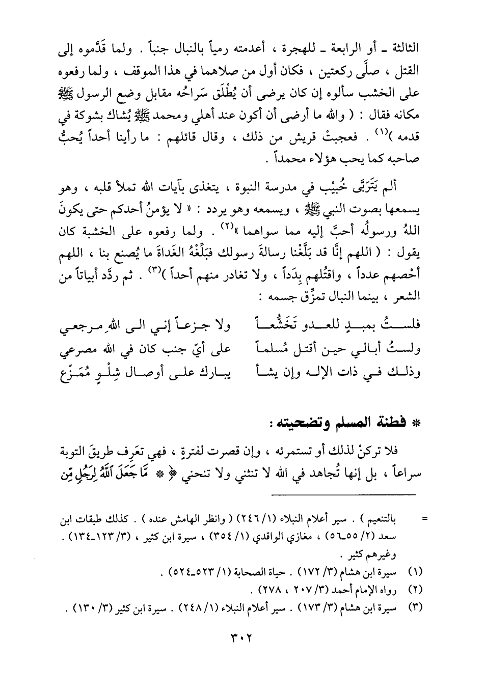 ألم يتربّى خبيب في مدرسة النبوة، يتغذى بايات الله تملأ قلبه، وهو يسمعها بصوت النبي صلّى الله عليه وسلم، ويسمعه وهو يردد: «لا يؤمن أحدكم حتى يكون الله ورسوله أحبّ إليه مما سواهما» «2» . ولما رفعوه على الخشبة كان يقول: (اللهم إنّا قد بلّغنا رسالة رسولك فبلّغه الغداة ما يصنع بنا، اللهم أحصهم عددا، واقتلهم بددا، ولا تغادر منهم أحدا) «3» . ثم ردّد أبياتا من الشعر، بينما النبال تمزّق جسمه: