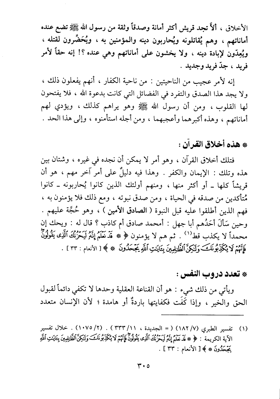 (1) تفسير الطبري (7/ 182) (الجديدة، 11/ 333) . (2/ 1075) . خلال تفسير الآية الكريمة: قَدْ نَعْلَمُ إِنَّهُ لَيَحْزُنُكَ الَّذِي يَقُولُونَ فَإِنَّهُمْ لا يُكَذِّبُونَكَ وَلكِنَّ الظَّالِمِينَ بِآياتِ اللَّهِ يَجْحَدُونَ [الأنعام: 33] .