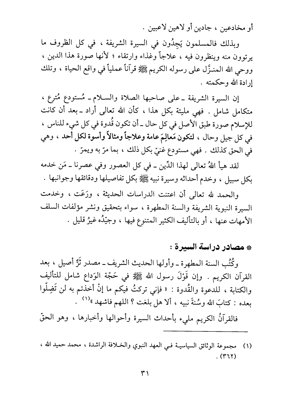 إن السيرة الشريفة- على صاحبها الصلاة والسلام- مستودع مترع، متكامل شامل. فهي مليئة بكل هذا، كأن الله تعالى أراد- بعد أن كانت للإسلام صورة طبق الأصل في كل حال- أن تكون قدوة في كل شيء للناس، في كل جيل وحال، لتكون معالم عامة وعلاجا ومثالا وأسوة لكل أحد، وهي في الحق كذلك. فهي مستودع غنيّ بكل ذلك، بما مرّ به ويمرّ.