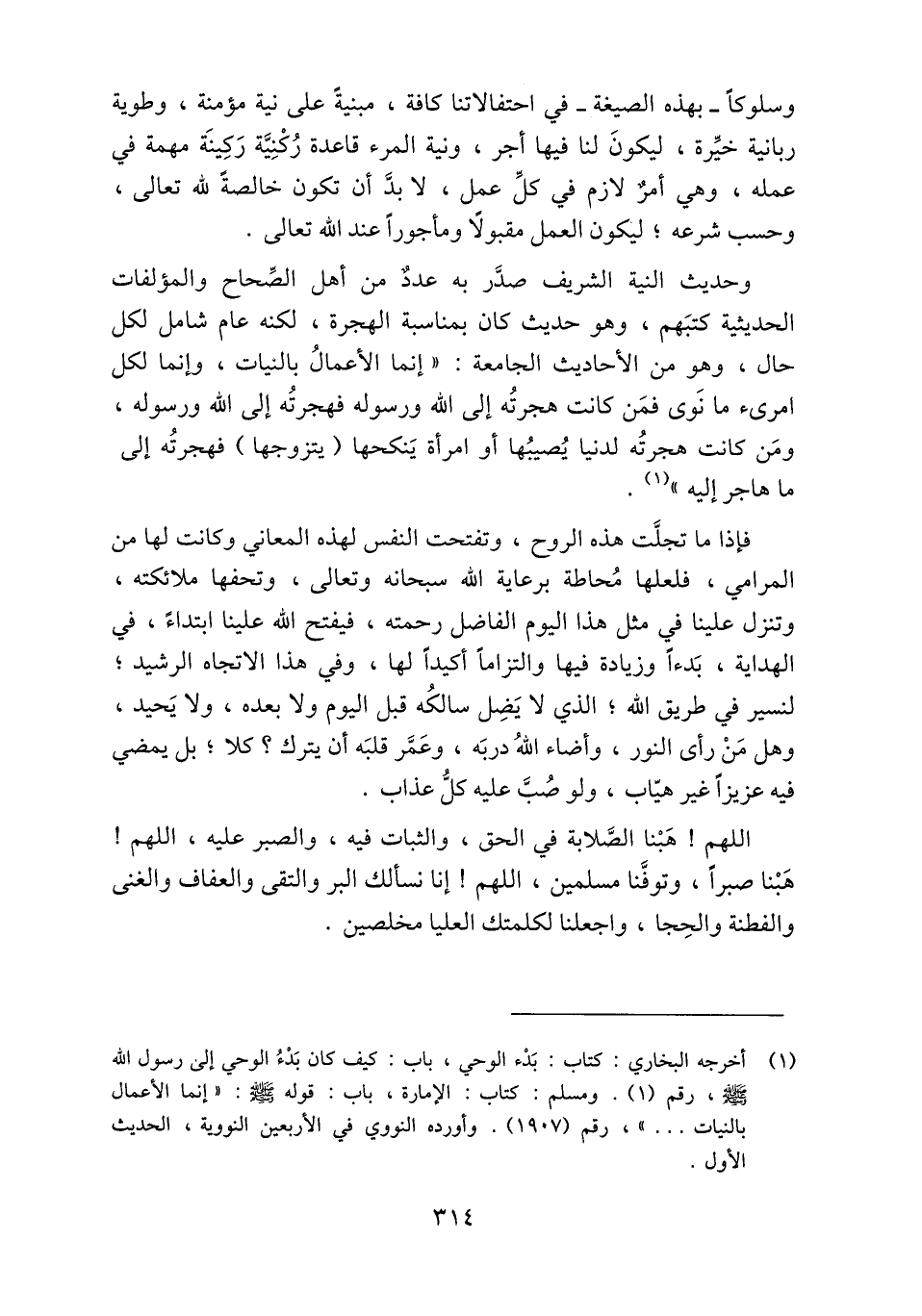 وحديث النية الشريف صدّر به عدد من أهل الصّحاح والمؤلفات الحديثية كتبهم، وهو حديث كان بمناسبة الهجرة، لكنه عام شامل لكل حال، وهو من الأحاديث الجامعة: «إنما الأعمال بالنيات، وإنما لكل امرئ ما نوى فمن كانت هجرته إلى الله ورسوله فهجرته إلى الله ورسوله، ومن كانت هجرته لدنيا يصيبها أو امرأة ينكحها (يتزوجها) فهجرته إلى ما هاجر إليه» «1» .