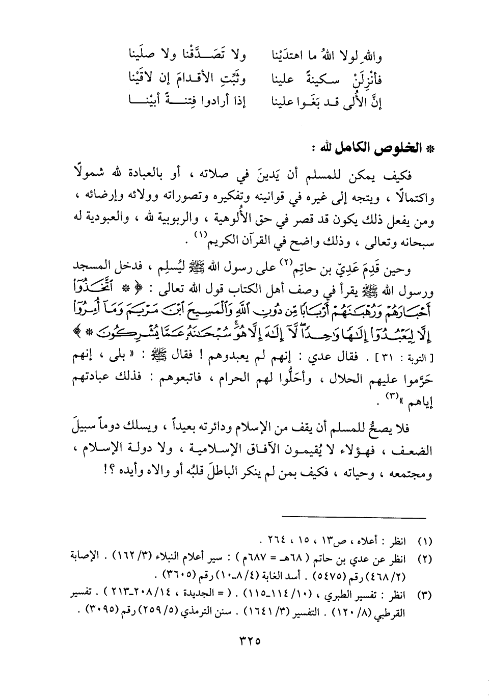 وحين قدم عديّ بن حاتم «2» على رسول الله صلّى الله عليه وسلّم ليسلم، فدخل المسجد ورسول الله صلّى الله عليه وسلم يقرأ في وصف أهل الكتاب قول الله تعالى: اتَّخَذُوا أَحْبارَهُمْ وَرُهْبانَهُمْ أَرْباباً مِنْ دُونِ اللَّهِ وَالْمَسِيحَ ابْنَ مَرْيَمَ وَما أُمِرُوا إِلَّا لِيَعْبُدُوا إِلهاً واحِداً لا إِلهَ إِلَّا هُوَ سُبْحانَهُ عَمَّا يُشْرِكُونَ [التوبة: 31] . فقال عدي: إنهم لم يعبدوهم! فقال صلّى الله عليه وسلم: «بلى، إنهم حرّموا عليهم الحلال، وأحلّوا لهم الحرام، فاتبعوهم: فذلك عبادتهم إياهم» «3» .