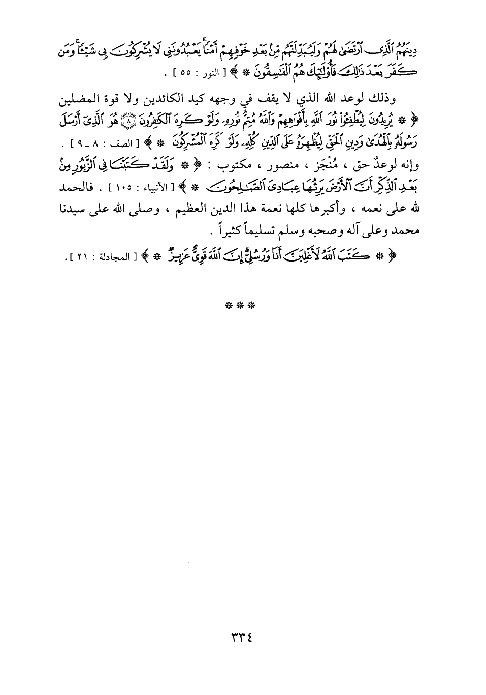 وإنه لوعد حق، منجز، منصور، مكتوب: وَلَقَدْ كَتَبْنا فِي الزَّبُورِ مِنْ بَعْدِ الذِّكْرِ أَنَّ الْأَرْضَ يَرِثُها عِبادِيَ الصَّالِحُونَ [الأنبياء: 105] . فالحمد لله على نعمه، وأكبرها كلها نعمة هذا الدين العظيم، وصلّى الله على سيدنا محمد وعلى آله وصحبه وسلّم تسليما كثيرا.