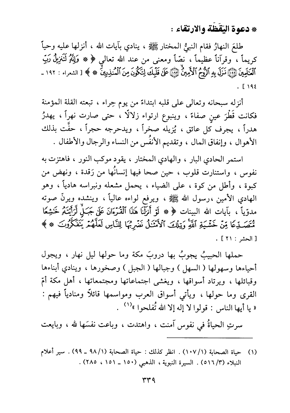 طلع النهار فقام النبيّ المختار صلّى الله عليه وسلم، ينادي بايات الله، أنزلها عليه وحيا كريما، وقرآنا عظيما، نصّا ومعنى من عند الله تعالى وَإِنَّهُ لَتَنْزِيلُ رَبِّ الْعالَمِينَ (192) نَزَلَ بِهِ الرُّوحُ الْأَمِينُ (193) عَلى قَلْبِكَ لِتَكُونَ مِنَ الْمُنْذِرِينَ [الشعراء: 192- 194] .