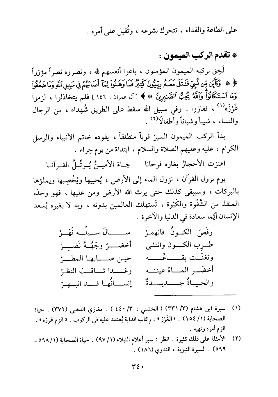 (1) سيرة ابن هشام (3/ 331) (الخشني، 3/ 440) . مغازي الذهبي (372) . حياة الصحابة (1/ 154) . «الغرز» : ركاب الدابة يعتمد عليه في الركوب. «الزم غرزه» : الزم أمره ونهيه.