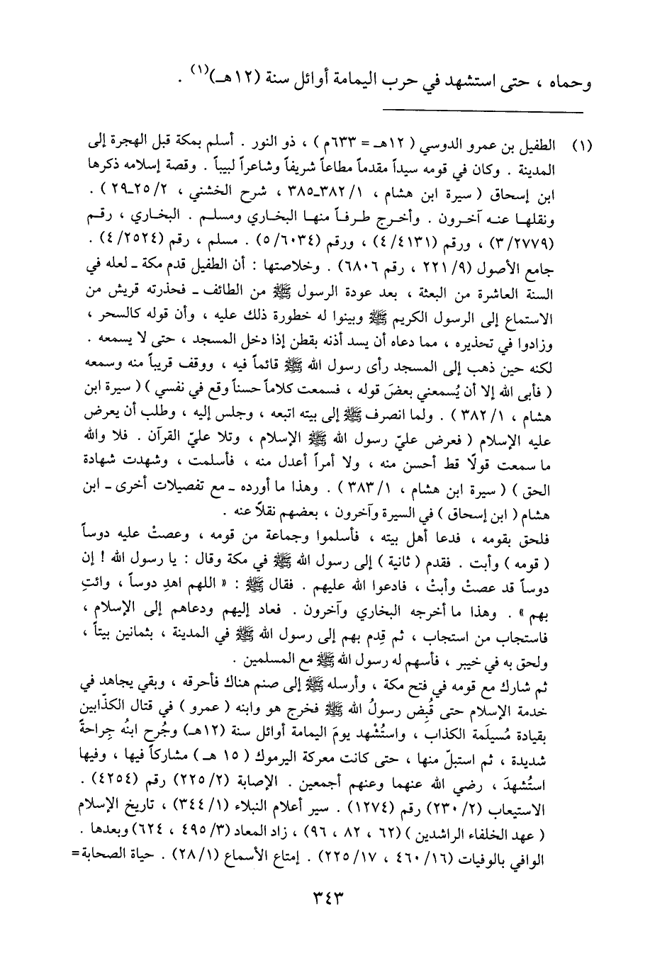 (1) الطفيل بن عمرو الدوسي (12 هـ 633 م) ، ذو النور. أسلم بمكة قبل الهجرة إلى المدينة. وكان في قومه سيدا مقدما مطاعا شريفا وشاعرا لبيبا. وقصة إسلامه ذكرها ابن إسحاق (سيرة ابن هشام، 1/ 382- 385، شرح الخشني، 2/ 25- 29) . ونقلها عنه آخرون. وأخرج طرفا منها البخاري ومسلم. البخاري، رقم (2779/ 3) ، ورقم (4131/ 4) ، ورقم (6034/ 5) . مسلم، رقم (2524/ 4) . جامع الأصول (9/ 221، رقم 6806) . وخلاصتها: أن الطفيل قدم مكة- لعله في السنة العاشرة من البعثة، بعد عودة الرسول صلّى الله عليه وسلّم من الطائف- فحذرته قريش من الاستماع إلى الرسول الكريم صلّى الله عليه وسلّم وبينوا له خطورة ذلك عليه، وأن قوله كالسحر، وزادوا في تحذيره، مما دعاه أن يسد أذنه بقطن إذا دخل المسجد، حتى لا يسمعه. لكنه حين ذهب إلى المسجد رأى رسول الله صلّى الله عليه وسلّم قائما فيه، ووقف قريبا منه وسمعه (فأبى الله إلا أن يسمعني بعض قوله، فسمعت كلاما حسنا وقع في نفسي) (سيرة ابن هشام، 1/ 382) . ولما انصرف صلّى الله عليه وسلّم إلى بيته اتبعه، وجلس إليه، وطلب أن يعرض عليه الإسلام (فعرض عليّ رسول الله صلّى الله عليه وسلّم الإسلام، وتلا عليّ القرآن. فلا والله ما سمعت قولا قط أحسن منه، ولا أمرا أعدل منه، فأسلمت، وشهدت شهادة الحق) (سيرة ابن هشام، 1/ 383) . وهذا ما أورده- مع تفصيلات أخرى- ابن هشام (ابن إسحاق) في السيرة وآخرون، بعضهم نقلا عنه. فلحق بقومه، فدعا أهل بيته، فأسلموا وجماعة من قومه، وعصت عليه دوسا (قومه) وأبت. فقدم (ثانية) إلى رسول الله صلّى الله عليه وسلّم في مكة وقال: يا رسول الله! إن دوسا قد عصت وأبت، فادعوا الله عليهم. فقال صلّى الله عليه وسلم: «اللهم اهد دوسا، وائت بهم» . وهذا ما أخرجه البخاري وآخرون. فعاد إليهم ودعاهم إلى الإسلام، فاستجاب من استجاب، ثم قدم بهم إلى رسول الله صلّى الله عليه وسلّم في المدينة، بثمانين بيتا، ولحق به في خيبر، فأسهم له رسول الله صلّى الله عليه وسلّم مع المسلمين. ثم شارك مع قومه في فتح مكة، وأرسله صلّى الله عليه وسلّم إلى صنم هناك فأحرقه، وبقي يجاهد في خدمة الإسلام حتى قبض رسول الله صلّى الله عليه وسلّم فخرج هو وابنه (عمرو) في قتال الكذّابين بقيادة مسيلمة الكذاب، واستشهد يوم اليمامة أوائل سنة (12 هـ) وجرح ابنه جراحة شديدة، ثم استبلّ منها، حتى كانت معركة اليرموك (15 هـ) مشاركا فيها، وفيها استشهد، رضي الله عنهما وعنهم أجمعين. الإصابة (2/ 225) رقم (4254) . الاستيعاب (2/ 230) رقم (1274) . سير أعلام النبلاء (1/ 344) ، تاريخ الإسلام (عهد الخلفاء الراشدين) (62، 82، 96) ، زاد المعاد (3/ 495، 624) وبعدها. الوافي بالوفيات (16/ 460، 17/ 225) . إمتاع الأسماع (1/ 28) حياة الصحابة