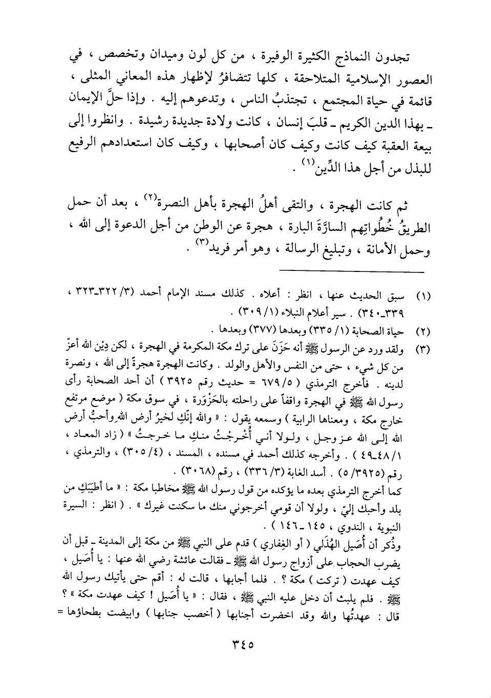 (3) ولقد ورد عن الرسول صلّى الله عليه وسلّم أنه حزن على ترك مكة المكرمة في الهجرة، لكن دين الله أعزّ من كل شيء، حتى من النفس والأهل والولد. وكانت الهجرة هجرة إلى الله، ونصرة لدينه. فأخرج الترمذي (5/ 679 حديث رقم 3925) أن أحد الصحابة رأى رسول الله صلّى الله عليه وسلّم في الهجرة واقفا على راحلته بالحزورة، في سوق مكة (موضع مرتفع خارج مكة، ومعناها الرابية) وسمعه يقول: «والله إنّك لخير أرض الله وأحبّ أرض الله إلى الله عز وجل، ولولا أني أخرجت منك ما خرجت» (زاد المعاد، 1/ 48- 49) . وأخرجه كذلك أحمد في مسنده، المسند، (4/ 305) ، والترمذي، رقم (3925/ 5) . أسد الغابة (3/ 336) ، رقم (3068) . كما أخرج الترمذي بعده ما يؤكده من قول رسول الله صلّى الله عليه وسلّم مخاطبا مكة: «ما أطيبك من بلد وأحبك إليّ، ولولا أن قومي أخرجوني منك ما سكنت غيرك» . (انظر: السيرة النبوية، الندوي، 145- 146) . وذكر أن أصيل الهذلي (أو الغفاري) قدم على النبي صلّى الله عليه وسلّم من مكة إلى المدينة- قبل أن يضرب الحجاب على أزواج رسول الله صلّى الله عليه وسلم- فقالت عائشة رضي الله عنها: يا أصيل، كيف عهدت (تركت) مكة؟. فلما أجابها، قالت له: أقم حتى يأتيك رسول الله صلى الله عليه وسلم. فلم يلبث أن دخل عليه النبي صلّى الله عليه وسلم، فقال: «يا أصيل! كيف عهدت مكة» ؟ قال: عهدتها والله وقد اخضرت أجنابها (أخصب جنابها) وابيضت بطحاؤها