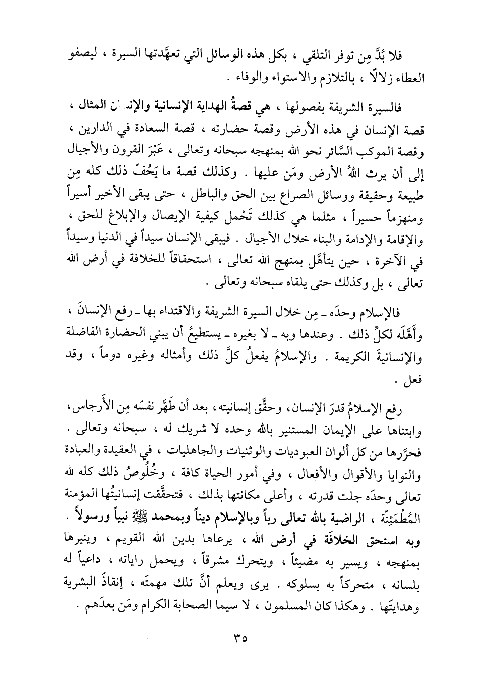 فالإسلام وحده- من خلال السيرة الشريفة والاقتداء بها- رفع الإنسان، وأهّله لكلّ ذلك. وعندها وبه- لا بغيره- يستطيع أن يا بني الحضارة الفاضلة والإنسانية الكريمة. والإسلام يفعل كلّ ذلك وأمثاله وغيره دوما، وقد فعل.
