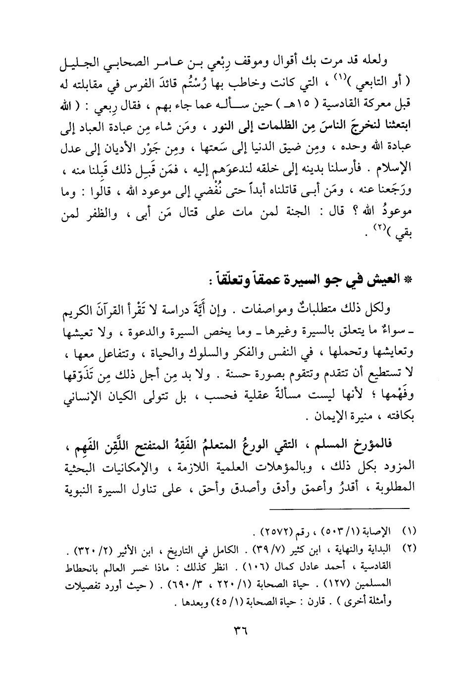 (2) البداية والنهاية، ابن كثير (7/ 39) . الكامل في التاريخ، ابن الأثير (2/ 320) . القادسية، أحمد عادل كمال (106) . انظر كذلك: ماذا خسر العالم بانحطاط المسلمين (127) . حياة الصحابة (1/ 220، 3/ 690) . (حيث أورد تفصيلات وأمثلة أخرى) . قارن: حياة الصحابة (1/ 45) وبعدها.