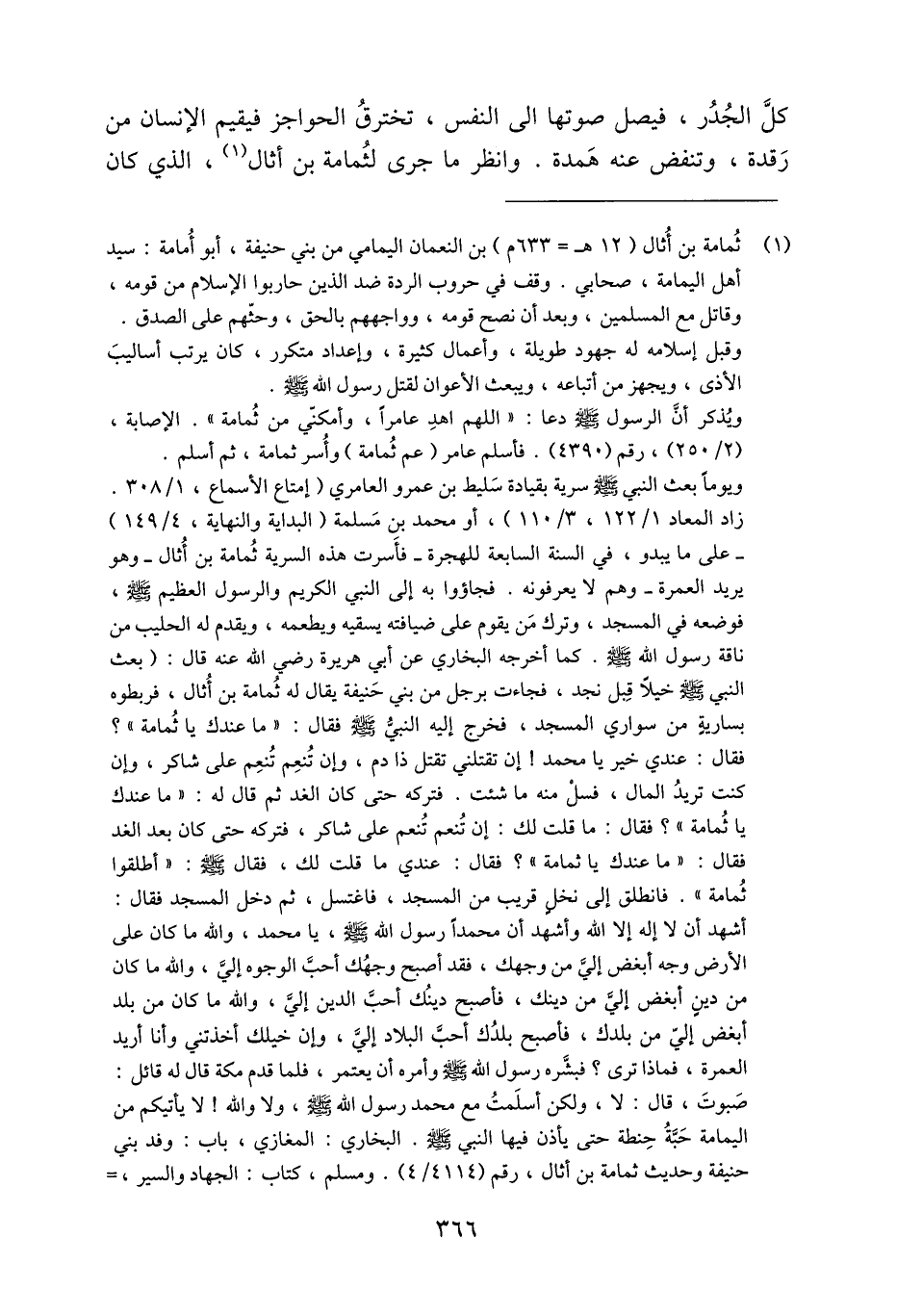 (1) ثمامة بن أثال (12 هـ 633 م) بن النعمان اليمامي من بني حنيفة، أبو أمامة: سيد أهل اليمامة، صحابي. وقف في حروب الردة ضد الذين حاربوا الإسلام من قومه، وقاتل مع المسلمين، وبعد أن نصح قومه، وواجههم بالحق، وحثّهم على الصدق. وقبل إسلامه له جهود طويلة، وأعمال كثيرة، وإعداد متكرر، كان يرتب أساليب الأذى، ويجهز من أتباعه، ويبعث الأعوان لقتل رسول الله صلّى الله عليه وسلم. ويذكر أنّ الرسول صلّى الله عليه وسلّم دعا: «اللهم اهد عامرا، وأمكنّي من ثمامة» . الإصابة، (2/ 250) ، رقم (4390) . فأسلم عامر (عم ثمامة) وأسر ثمامة، ثم أسلم. ويوما بعث النبي صلّى الله عليه وسلّم سرية بقيادة سليط بن عمرو العامري (إمتاع الأسماع، 1/ 308. زاد المعاد 1/ 122، 3/ 110) ، أو محمد بن مسلمة (البداية والنهاية، 4/ 149) على ما يبدو، في السنة السابعة للهجرة- فأسرت هذه السرية ثمامة بن أثال- وهو يريد العمرة- وهم لا يعرفونه. فجاؤوا به إلى النبي الكريم والرسول العظيم صلّى الله عليه وسلم، فوضعه في المسجد، وترك من يقوم على ضيافته يسقيه ويطعمه، ويقدم له الحليب من ناقة رسول الله صلّى الله عليه وسلم. كما أخرجه البخاري عن أبي هريرة رضي الله عنه قال: (بعث النبي صلّى الله عليه وسلّم خيلا قبل نجد، فجاءت برجل من بني حنيفة يقال له ثمامة بن أثال، فربطوه بسارية من سواري المسجد، فخرج إليه النبيّ صلّى الله عليه وسلّم فقال: «ما عندك يا ثمامة» ؟ فقال: عندي خير يا محمد! إن تقتلني تقتل ذا دم، وإن تنعم تنعم على شاكر، وإن كنت تريد المال، فسل منه ما شئت. فتركه حتى كان الغد ثم قال له: «ما عندك يا ثمامة» ؟ فقال: ما قلت لك: إن تنعم تنعم على شاكر، فتركه حتى كان بعد الغد فقال: «ما عندك يا ثمامة» ؟ فقال: عندي ما قلت لك، فقال صلّى الله عليه وسلم: «أطلقوا ثمامة» . فانطلق إلى نخل قريب من المسجد، فاغتسل، ثم دخل المسجد فقال: أشهد ألاإله إلا الله وأشهد أن محمدا رسول الله صلّى الله عليه وسلم، يا محمد، والله ما كان على الأرض وجه أبغض إليّ من وجهك، فقد أصبح وجهك أحبّ الوجوه إليّ، والله ما كان من دين أبغض إليّ من دينك، فأصبح دينك أحبّ الدين إليّ، والله ما كان من بلد أبغض إليّ من بلدك، فأصبح بلدك أحبّ البلاد إليّ، وإن خيلك أخذتني وأنا أريد العمرة، فماذا ترى؟ فبشّره رسول الله صلّى الله عليه وسلّم وأمره أن يعتمر، فلما قدم مكة قال له قائل: صبوت، قال: لا، ولكن أسلمت مع محمد رسول الله صلّى الله عليه وسلم، ولا والله! لا يأتيكم من اليمامة حبّة حنطة حتى يأذن فيها النبي صلّى الله عليه وسلم. البخاري: المغازي، باب: وفد بني حنيفة وحديث ثمامة بن أثال، رقم (4114/ 4) . ومسلم، كتاب: الجهاد والسير،