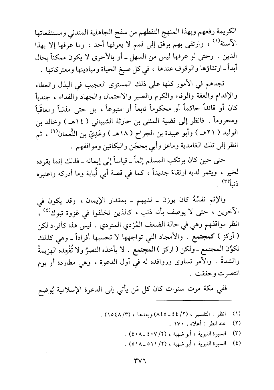 والإثم نفسه كان يوزن- لديهم- بمقدار الإيمان، وقد يكون في الآخرين، حتى لا يوصف بأنه ذنب، كالذين تخلفوا في غزوة تبوك «4» ، انظر مواقفهم وهي في حالة الضعف المردي المتردي. ليس هذا كأفراد لكن (أركز) كمجتمع. والأمجاد التي تواجهها لا تحسبها أفرادا- وهي كذلك تكوّن المجتمع- ولكن (اركز) المجتمع. لا يأخذه النصر ولا تقعده الهزيمة والشدة. والأمر تساوى وروافده له في أول الدعوة، وهي مطاردة أو يوم انتصرت وحققت.