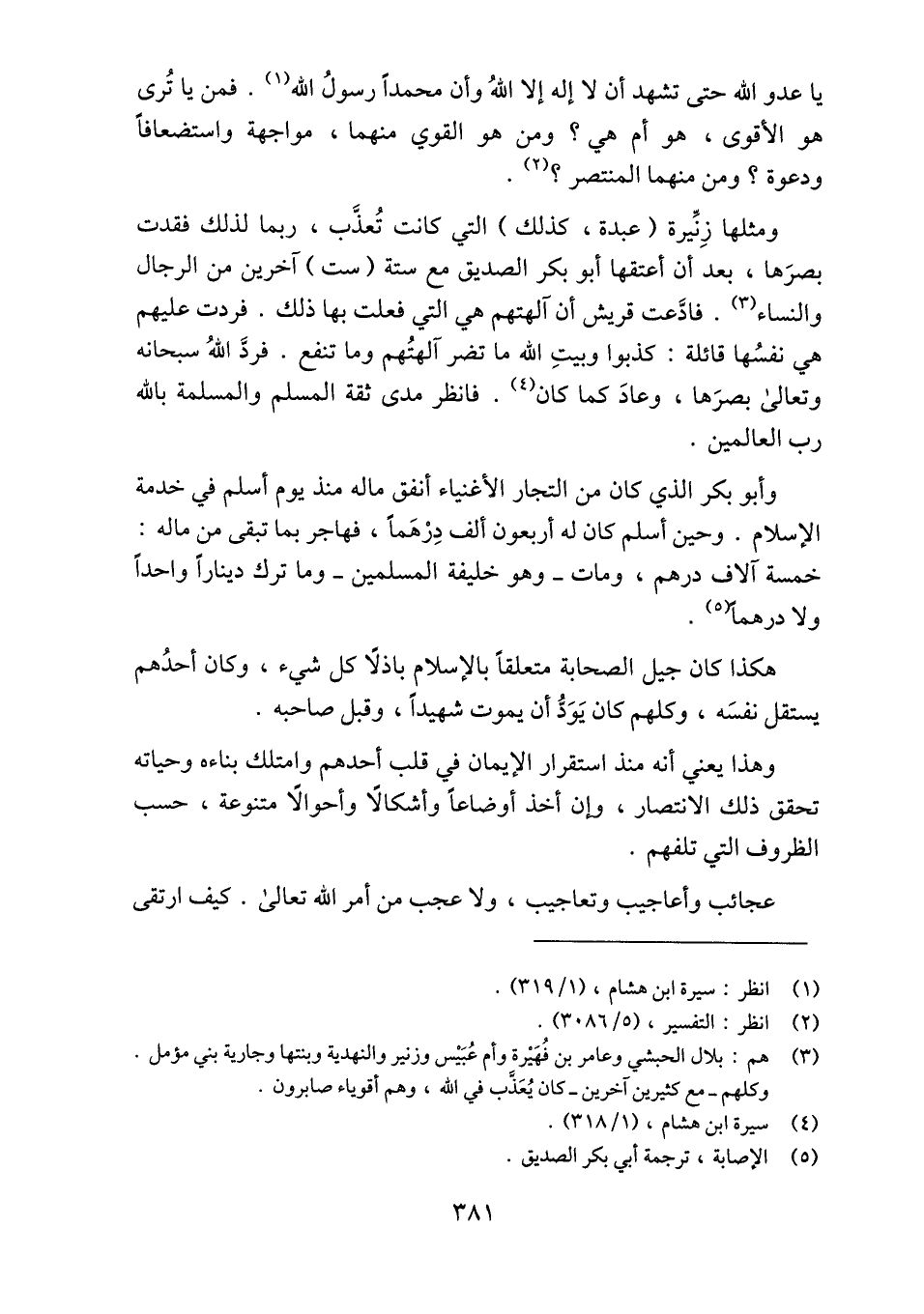 (3) هم: بلال الحبشي وعامر بن فهيرة وأم عبيس وزنير والنهدية وبنتها وجارية بني مؤمل. وكلهم- مع كثيرين آخرين- كان يعذّب في الله، وهم أقوياء صابرون.