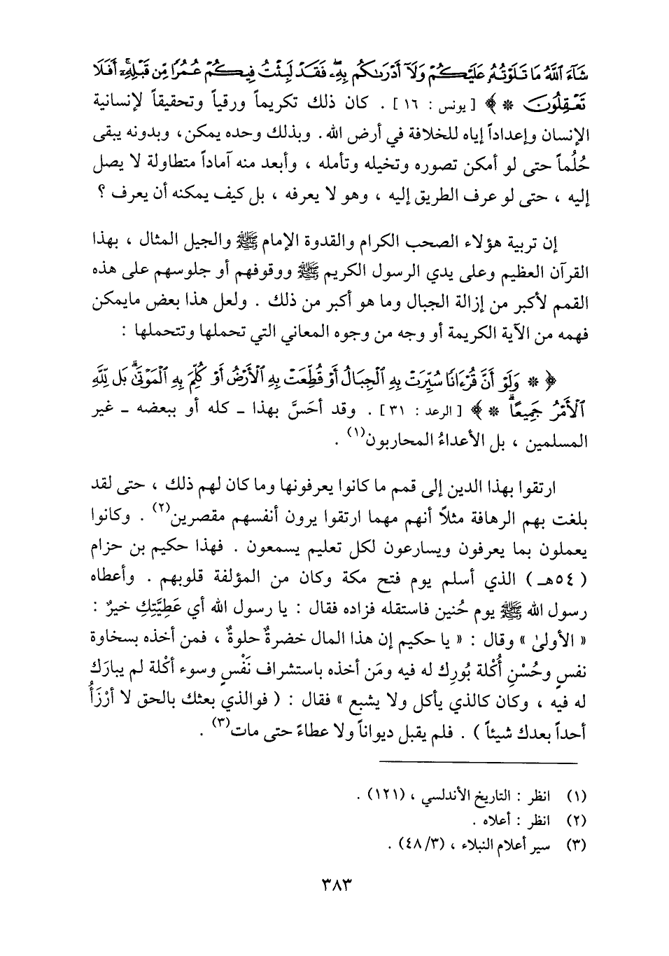 شاءَ اللَّهُ ما تَلَوْتُهُ عَلَيْكُمْ وَلا أَدْراكُمْ بِهِ فَقَدْ لَبِثْتُ فِيكُمْ عُمُراً مِنْ قَبْلِهِ أَفَلا تَعْقِلُونَ [يونس: 16] . كان ذلك تكريما ورقيا وتحقيقا لإنسانية الإنسان وإعدادا إياه للخلافة في أرض الله. وبذلك وحده يمكن، وبدونه يبقى حلما حتى لو أمكن تصوره وتخيله وتأمله، وأبعد منه آمادا متطاولة لا يصل إليه، حتى لو عرف الطريق إليه، وهو لا يعرفه، بل كيف يمكنه أن يعرف؟