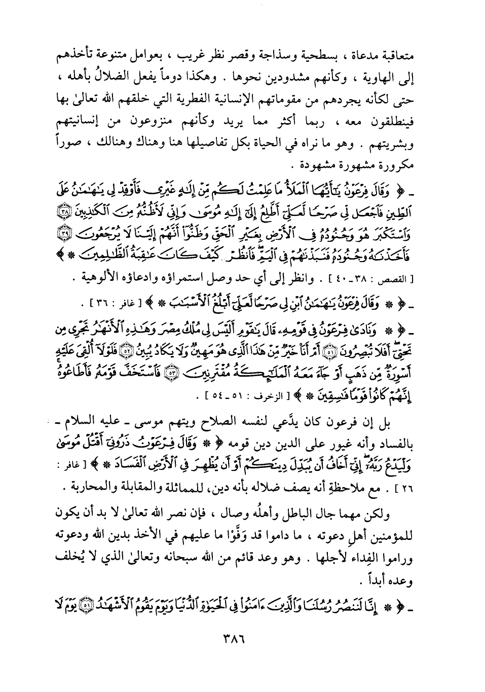 وَقالَ فِرْعَوْنُ يا أَيُّهَا الْمَلَأُ ما عَلِمْتُ لَكُمْ مِنْ إِلهٍ غَيْرِي فَأَوْقِدْ لِي يا هامانُ عَلَى الطِّينِ فَاجْعَلْ لِي صَرْحاً لَعَلِّي أَطَّلِعُ إِلى إِلهِ مُوسى وَإِنِّي لَأَظُنُّهُ مِنَ الْكاذِبِينَ (38) وَاسْتَكْبَرَ هُوَ وَجُنُودُهُ فِي الْأَرْضِ بِغَيْرِ الْحَقِّ وَظَنُّوا أَنَّهُمْ إِلَيْنا لا يُرْجَعُونَ (39) فَأَخَذْناهُ وَجُنُودَهُ فَنَبَذْناهُمْ فِي الْيَمِّ فَانْظُرْ كَيْفَ كانَ عاقِبَةُ الظَّالِمِينَ [القصص: 38- 40] . وانظر إلى أي حد وصل استمراؤه وادعاؤه الألوهية.
