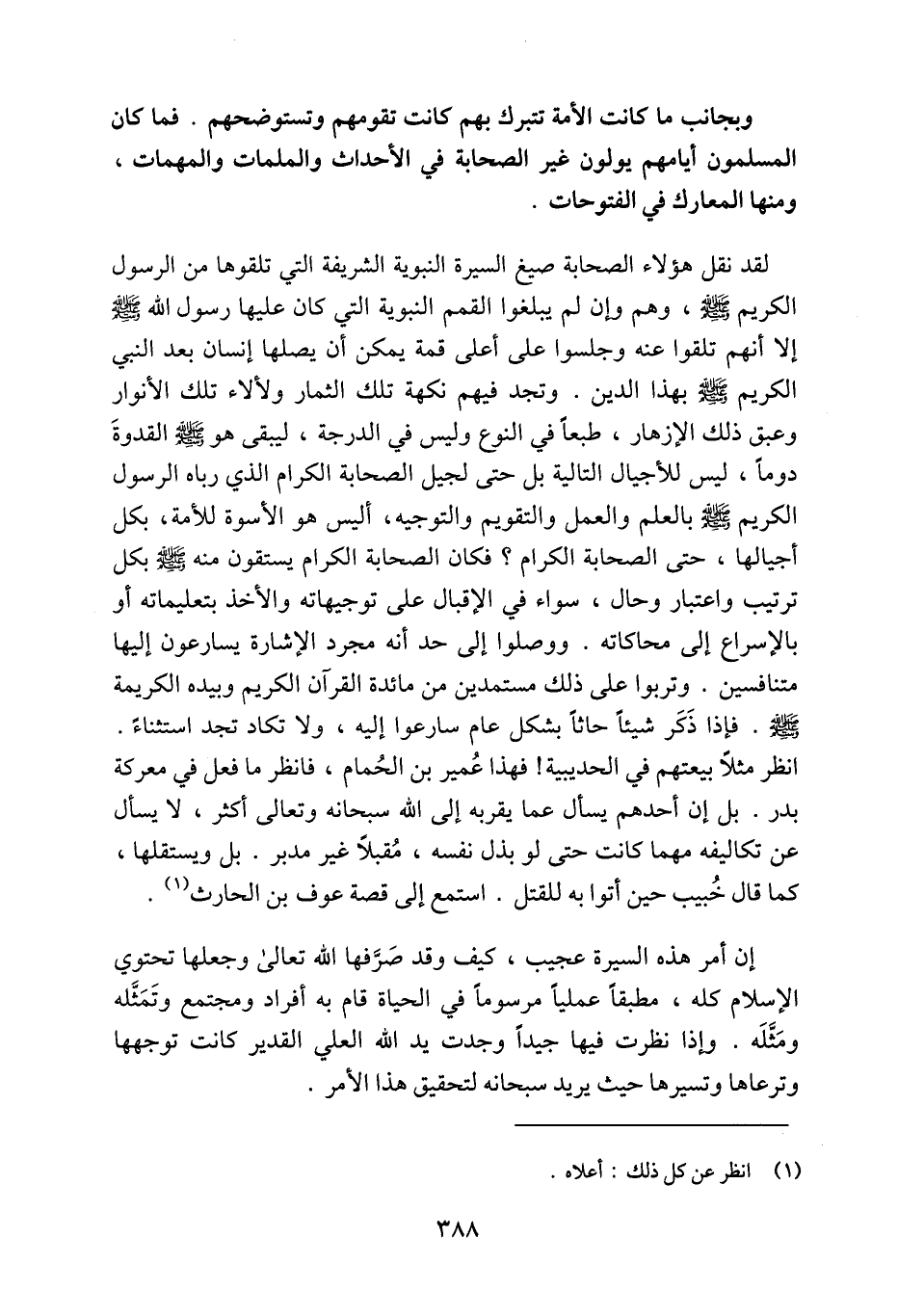 لقد نقل هؤلاء الصحابة صيغ السيرة النبوية الشريفة التي تلقوها من الرسول الكريم صلّى الله عليه وسلم، وهم وإن لم يبلغوا القمم النبوية التي كان عليها رسول الله صلّى الله عليه وسلم إلا أنهم تلقوا عنه وجلسوا على أعلى قمة يمكن أن يصلها إنسان بعد النبي الكريم صلّى الله عليه وسلّم بهذا الدين. وتجد فيهم نكهة تلك الثمار ولألاء تلك الأنوار وعبق ذلك الإزهار، طبعا في النوع وليس في الدرجة، ليبقى هو صلّى الله عليه وسلّم القدوة دوما، ليس للأجيال التالية بل حتى لجيل الصحابة الكرام الذي رباه الرسول الكريم صلّى الله عليه وسلّم بالعلم والعمل والتقويم والتوجيه، أليس هو الأسوة للأمة، بكل أجيالها، حتى الصحابة الكرام؟ فكان الصحابة الكرام يستقون منه صلّى الله عليه وسلّم بكل ترتيب واعتبار وحال، سواء في الإقبال على توجيهاته والأخذ بتعليماته أو بالإسراع إلى محاكاته. ووصلوا إلى حد أنه مجرد الإشارة يسارعون إليها متنافسين. وتربوا على ذلك مستمدين من مائدة القرآن الكريم وبيده الكريمة صلى الله عليه وسلم. فإذا ذكر شيئا حاثا بشكل عام سارعوا إليه، ولا تكاد تجد استثناء.