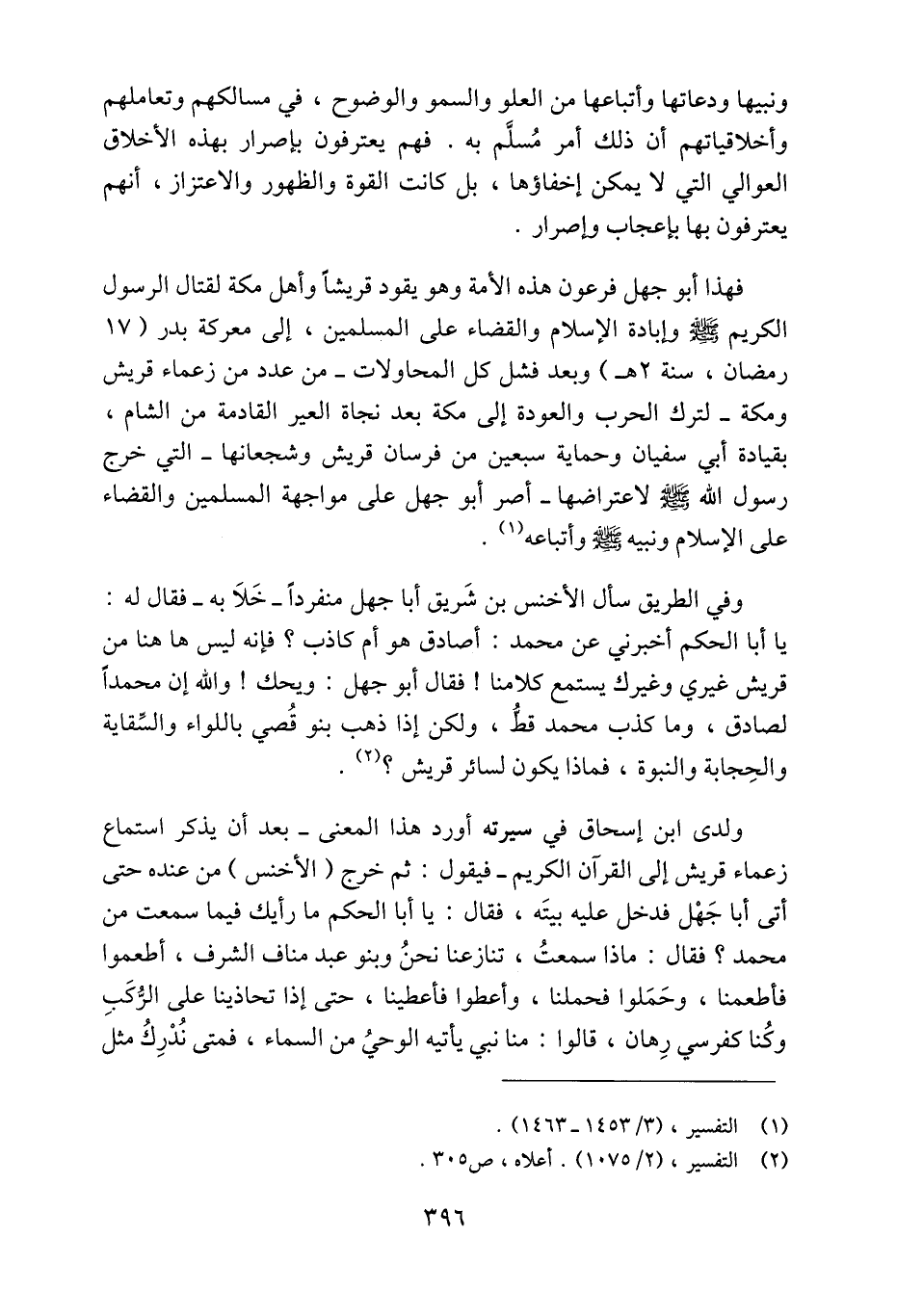 ونبيها ودعاتها وأتباعها من العلو والسمو والوضوح، في مسالكهم وتعاملهم وأخلاقياتهم أن ذلك أمر مسلّم به. فهم يعترفون بإصرار بهذه الأخلاق العوالي التي لا يمكن إخفاؤها، بل كانت القوة والظهور والاعتزاز، أنهم يعترفون بها بإعجاب وإصرار.