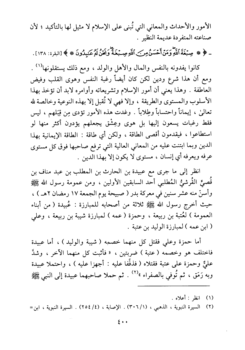أما حمزة وعلي فقتل كل منهما خصمه (شيبة والوليد) ، أما عبيدة فاختلف هو وخصمه (عتبة) ضربتين، «فأثبت كل منهما الآخر، وشدّ عليّ وحمزة على عتبة فقتلاه (فذفّفا عليه: أجهزا عليه) ، واحتملا عبيدة وبه رمق، ثم توفي بالصفراء» «2» . ثم حملا صاحبهما عبيدة إلى النبي صلّى الله عليه وسلم