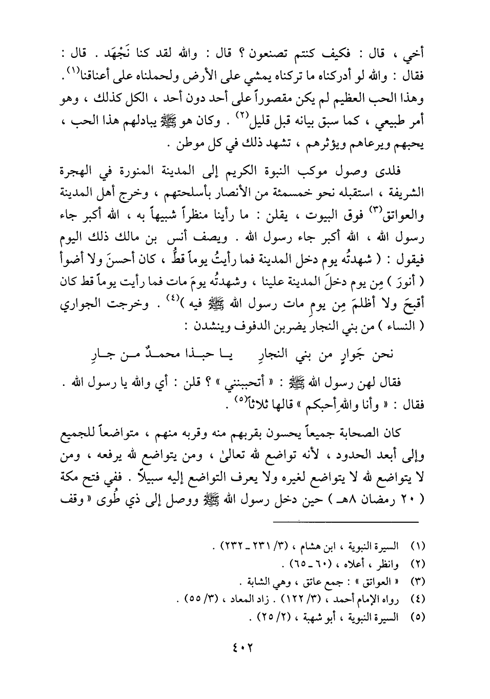 فلدى وصول موكب النبوة الكريم إلى المدينة المنورة في الهجرة الشريفة، استقبله نحو خمسمئة من الأنصار بأسلحتهم، وخرج أهل المدينة والعواتق «3» فوق البيوت، يقلن: ما رأينا منظرا شبيها به، الله أكبر جاء رسول الله، الله أكبر جاء رسول الله. ويصف أنس بن مالك ذلك اليوم فيقول: (شهدته يوم دخل المدينة فما رأيت يوما قطّ، كان أحسن ولا أضوأ (أنور) من يوم دخل المدينة علينا، وشهدته يوم مات فما رأيت يوما قط كان أقبح ولا أظلم من يوم مات رسول الله صلّى الله عليه وسلّم فيه) «4» . وخرجت الجواري (النساء) من بني النجار يضربن الدفوف وينشدن:
