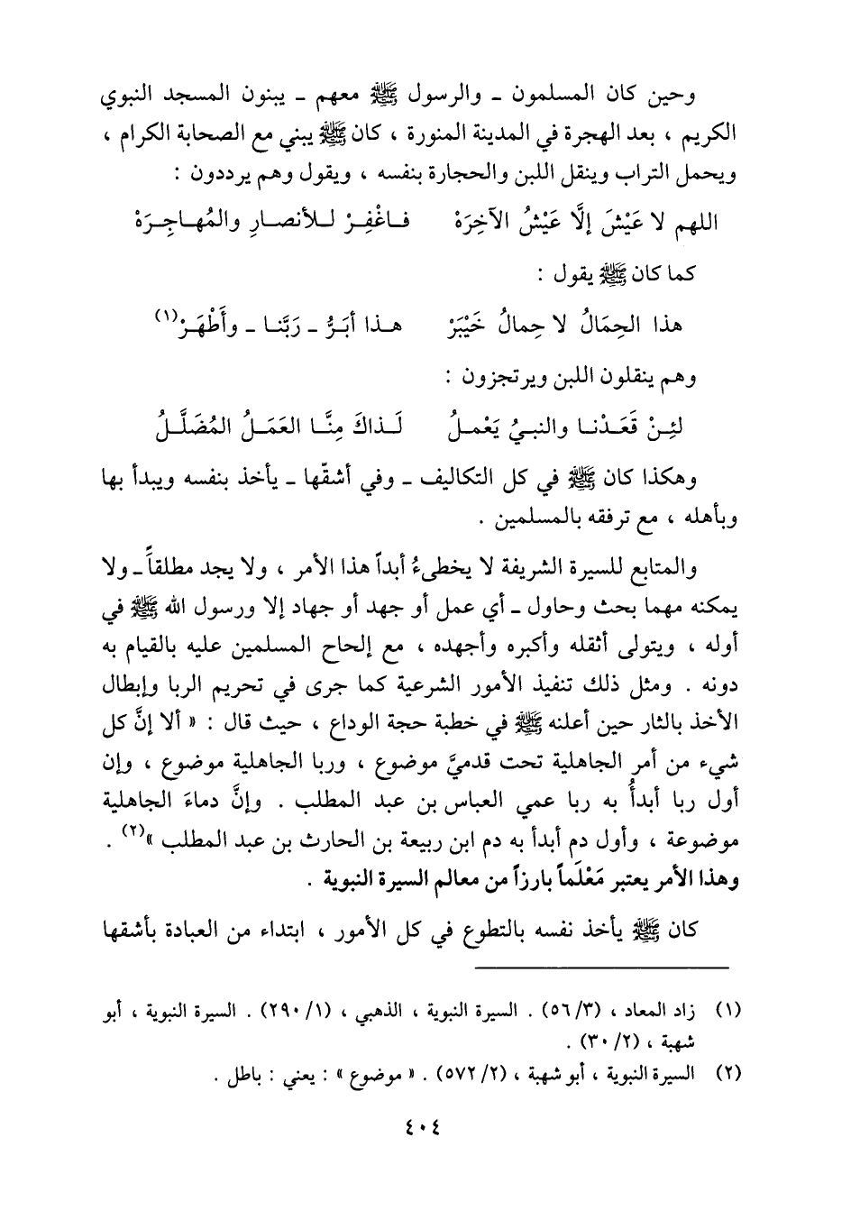 والمتابع للسيرة الشريفة لا يخطئ أبدا هذا الأمر، ولا يجد مطلقا- ولا يمكنه مهما بحث وحاول- أي عمل أو جهد أو جهاد إلا ورسول الله صلّى الله عليه وسلّم في أوله، ويتولى أثقله وأكبره وأجهده، مع إلحاح المسلمين عليه بالقيام به دونه. ومثل ذلك تنفيذ الأمور الشرعية كما جرى في تحريم الربا وإبطال الأخذ بالثار حين أعلنه صلّى الله عليه وسلّم في خطبة حجة الوداع، حيث قال: «ألا إنّ كل شيء من أمر الجاهلية تحت قدميّ موضوع، وربا الجاهلية موضوع، وإن أول ربا أبدأ به ربا عمي العباس بن عبد المطلب. وإنّ دماء الجاهلية موضوعة، وأول دم أبدا به دم ابن ربيعة بن الحارث بن عبد المطلب» «2» .