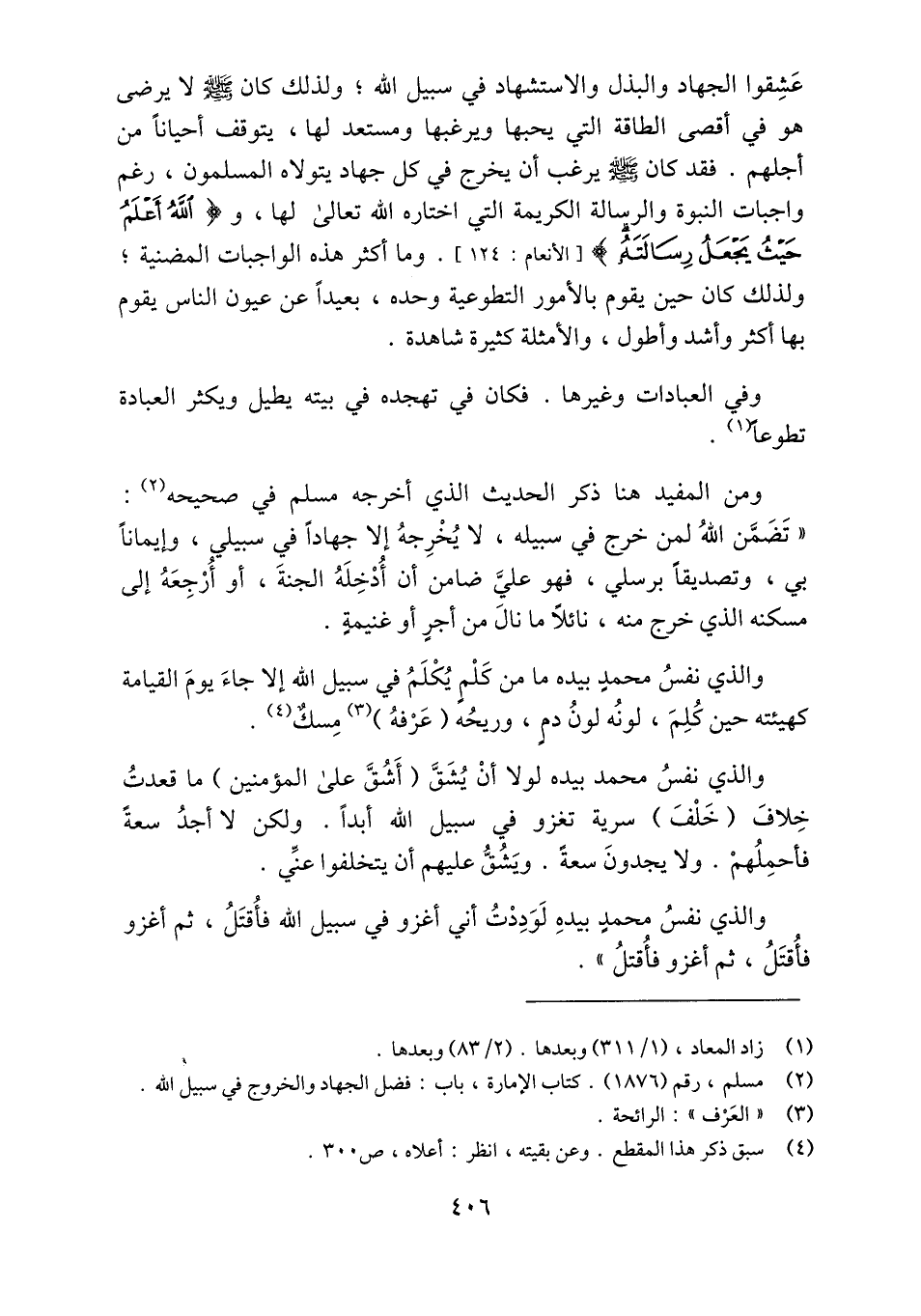 عشقوا الجهاد والبذل والاستشهاد في سبيل الله؛ ولذلك كان صلّى الله عليه وسلّم لا يرضى هو في أقصى الطاقة التي يحبها ويرغبها ومستعد لها، يتوقف أحيانا من أجلهم. فقد كان صلّى الله عليه وسلّم يرغب أن يخرج في كل جهاد يتولاه المسلمون، رغم واجبات النبوة والرسالة الكريمة التي اختاره الله تعالى لها، واللَّهُ أَعْلَمُ حَيْثُ يَجْعَلُ رِسالَتَهُ [الأنعام: 124] . وما أكثر هذه الواجبات المضنية؛ ولذلك كان حين يقوم بالأمور التطوعية وحده، بعيدا عن عيون الناس يقوم بها أكثر وأشد وأطول، والأمثلة كثيرة شاهدة.