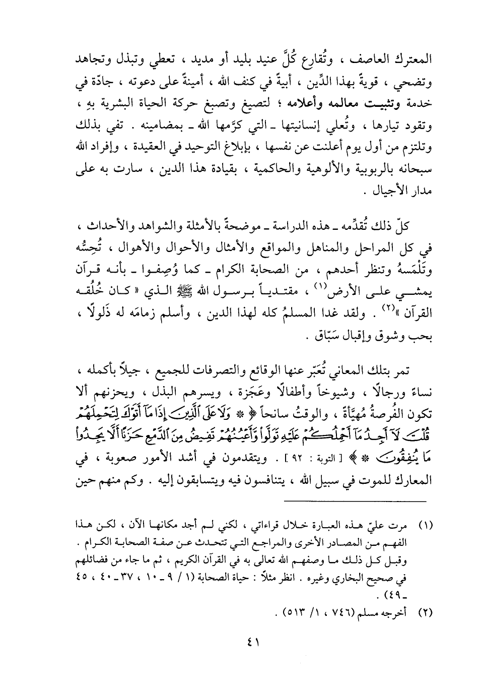 كلّ ذلك تقدّمه- هذه الدراسة- موضحة بالأمثلة والشواهد والأحداث، في كل المراحل والمناهل والمواقع والأمثال والأحوال والأهوال، تحسّه وتلمسه وتنظر أحدهم، من الصحابة الكرام- كما وصفوا- بأنه قرآن يمشي على الأرض «1» ، مقتديا برسول الله صلّى الله عليه وسلم الذي «كان خلقه القرآن» «2» . ولقد غدا المسلم كله لهذا الدين، وأسلم زمامه له ذلولا، بحب وشوق وإقبال سبّاق.