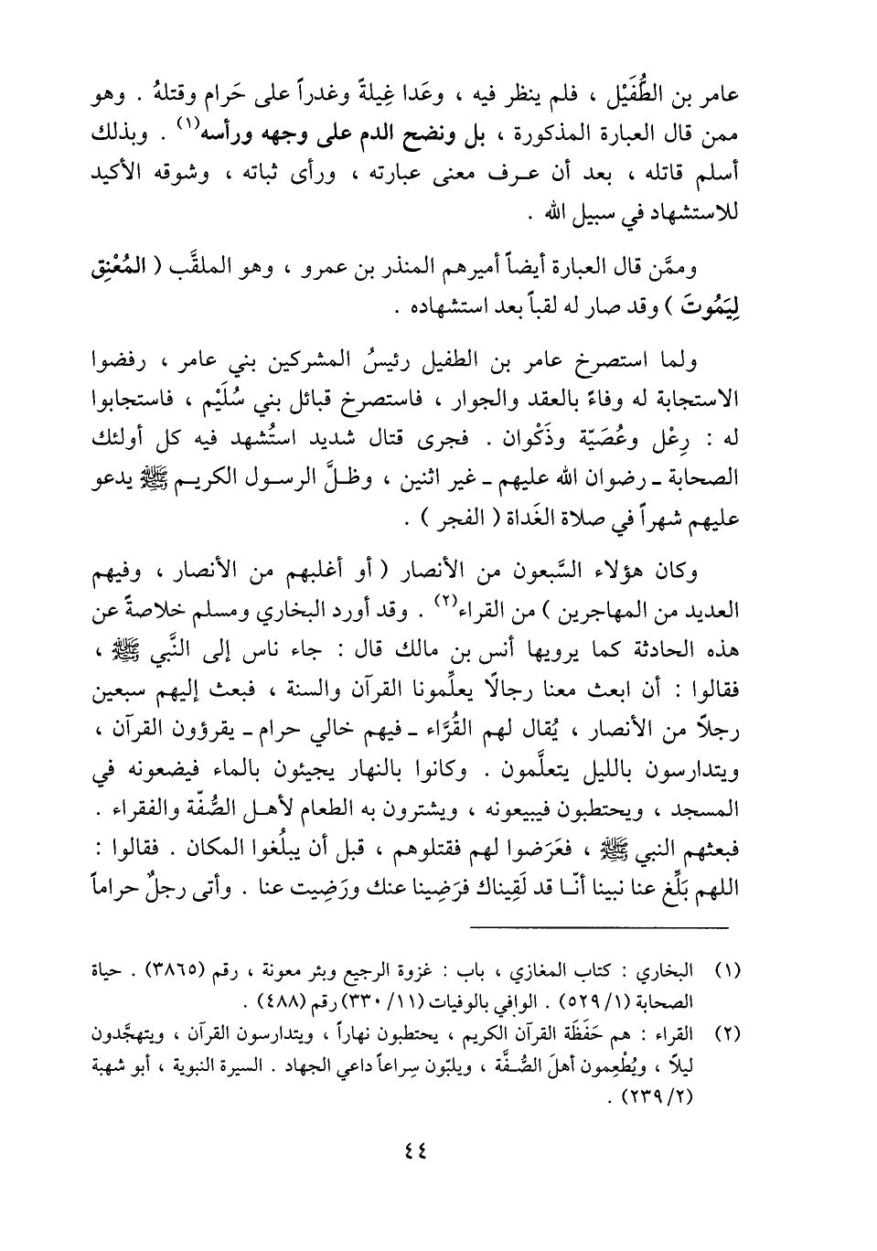 وكان هؤلاء السّبعون من الأنصار (أو أغلبهم من الأنصار، وفيهم العديد من المهاجرين) من القراء «2» . وقد أورد البخاري ومسلم خلاصة عن هذه الحادثة كما يرويها أنس بن مالك قال: جاء ناس إلى النّبي صلّى الله عليه وسلم، فقالوا: أن ابعث معنا رجالا يعلّمونا القرآن والسنة، فبعث إليهم سبعين رجلا من الأنصار، يقال لهم القرّاء- فيهم خالي حرام- يقرؤون القرآن، ويتدارسون بالليل يتعلّمون. وكانوا بالنهار يجيئون بالماء فيضعونه في المسجد، ويحتطبون فيبيعونه، ويشترون به الطعام لأهل الصّفّة والفقراء.