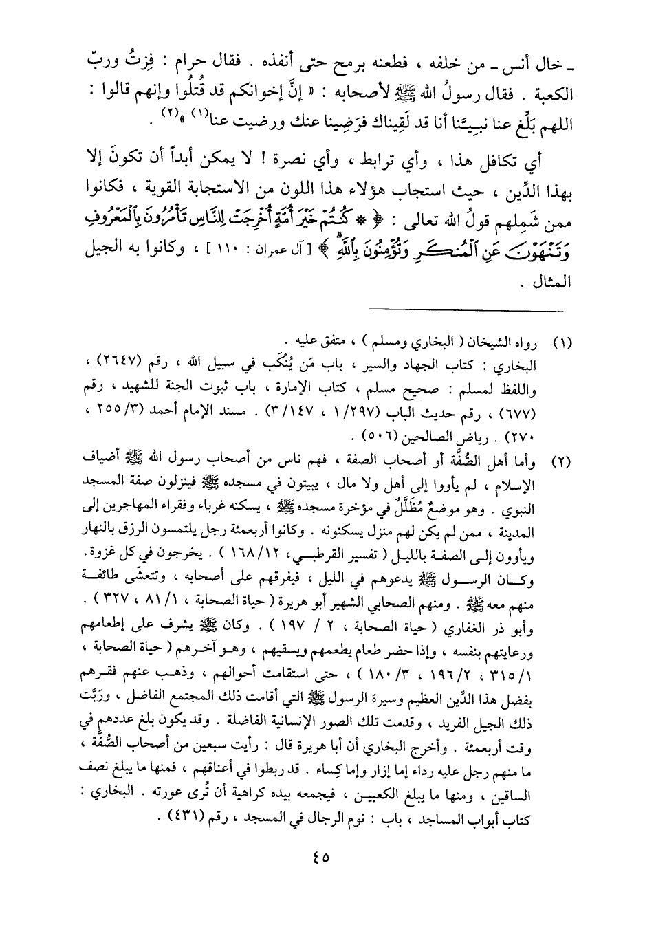 (2) وأما أهل الصّفّة أو أصحاب الصفة، فهم ناس من أصحاب رسول الله صلّى الله عليه وسلم أضياف الإسلام، لم يأووا إلى أهل ولا مال، يبيتون في مسجده صلّى الله عليه وسلم فينزلون صفة المسجد النبوي. وهو موضع مظلّل في مؤخرة مسجده صلّى الله عليه وسلم، يسكنه غرباء وفقراء المهاجرين إلى المدينة، ممن لم يكن لهم منزل يسكنونه. وكانوا أربعمئة رجل يلتمسون الرزق بالنهار ويأوون إلى الصفة بالليل (تفسير القرطبي، 12/ 168) . يخرجون في كل غزوة. وكان الرسول صلّى الله عليه وسلم يدعوهم في الليل. فيفرقهم على أصحابه، وتتعشّى طائفة منهم معه صلّى الله عليه وسلم. ومنهم الصحابي الشهير أبو هريرة (حياة الصحابة، 1/ 81، 327) . وأبو ذر الغفاري (حياة الصحابة، 2/ 197) . وكان صلّى الله عليه وسلم يشرف على إطعامهم ورعايتهم بنفسه، وإذا حضر طعام يطعمهم ويسقيهم، وهو آخرهم (حياة الصحابة، 1/ 315، 2/ 196، 3/ 180) ، حتى استقامت أحوالهم، وذهب عنهم فقرهم بفضل هذا الدّين العظيم وسيرة الرسول صلّى الله عليه وسلم التي أقامت ذلك المجتمع الفاضل، وربّت ذلك الجيل الفريد، وقدمت تلك الصور الإنسانية الفاضلة. وقد يكون بلغ عددهم في وقت أربعمئة. وأخرج البخاري أن أبا هريرة قال: رأيت سبعين من أصحاب الصّفّة، ما منهم رجل عليه رداء إما إزار وإما كساء. قد ربطوا في أعناقهم. فمنها ما يبلغ نصف الساقين، ومنها ما يبلغ الكعبين، فيجمعه بيده كراهية أن ترى عورته. البخاري: كتاب أبواب المساجد، باب: نوم الرجال في المسجد، رقم (431) .