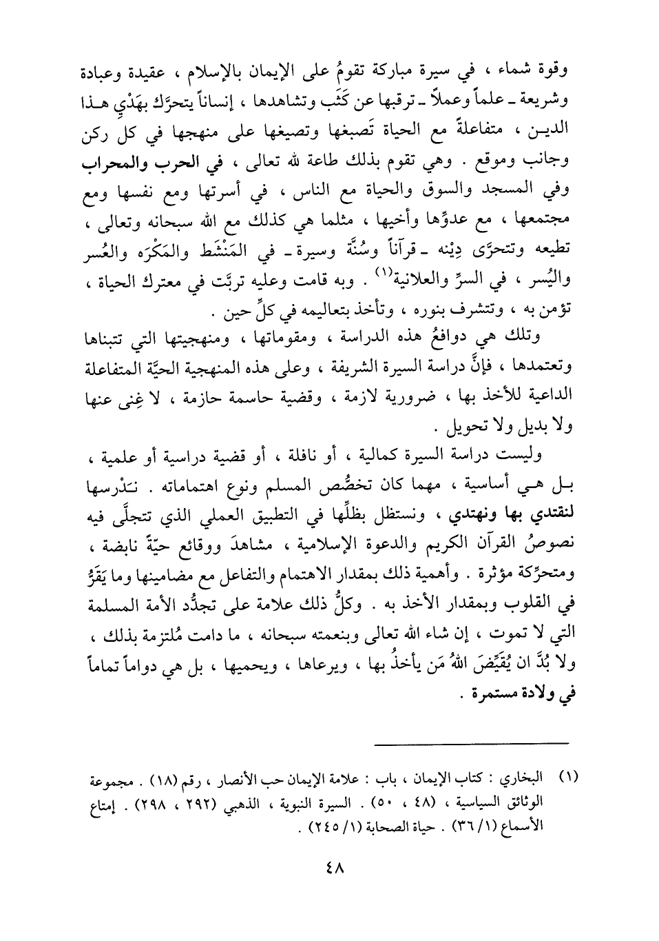 وليست دراسة السيرة كمالية، أو نافلة، أو قضية دراسية أو علمية، بل هي أساسية، مهما كان تخصّص المسلم ونوع اهتماماته. ندرسها لنقتدي بها ونهتدي، ونستظل بظلّها في التطبيق العملي الذي تتجلّى فيه نصوص القرآن الكريم والدعوة الإسلامية، مشاهد ووقائع حيّة نابضة، ومتحرّكة مؤثرة. وأهمية ذلك بمقدار الاهتمام والتفاعل مع مضامينها وما يقرّ في القلوب وبمقدار الأخذ به. وكلّ ذلك علامة على تجدّد الأمة المسلمة التي لا تموت، إن شاء الله تعالى وبنعمته سبحانه، ما دامت ملتزمة بذلك، ولا بدّ ان يقيّض الله من يأخذ بها، ويرعاها، ويحميها، بل هي دواما تماما في ولادة مستمرة.